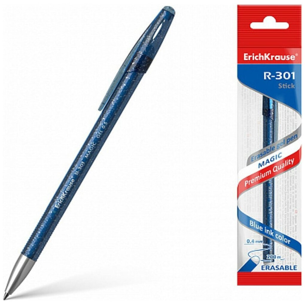Гелевая ручка Stick со стираемыми чернилами, стандартным типом пишущего узла и заменяемым стержнем. Ручка имеет полупрозрачный, тонированный круглый корпус с блестками, оснащенный заглушкой-ластиком. Пишущий узел с диаметром шарика 0.5 мм в сочетании с гелевыми быстросохнущими чернилами обеспечивает точное и быстрое письмо без усилий. Длина непрерывной линии составляет 200 м при толщине 0.4 мм. Модель R-301 Magic Gel - ценовой лидер в категории ручек пиши-стирай.