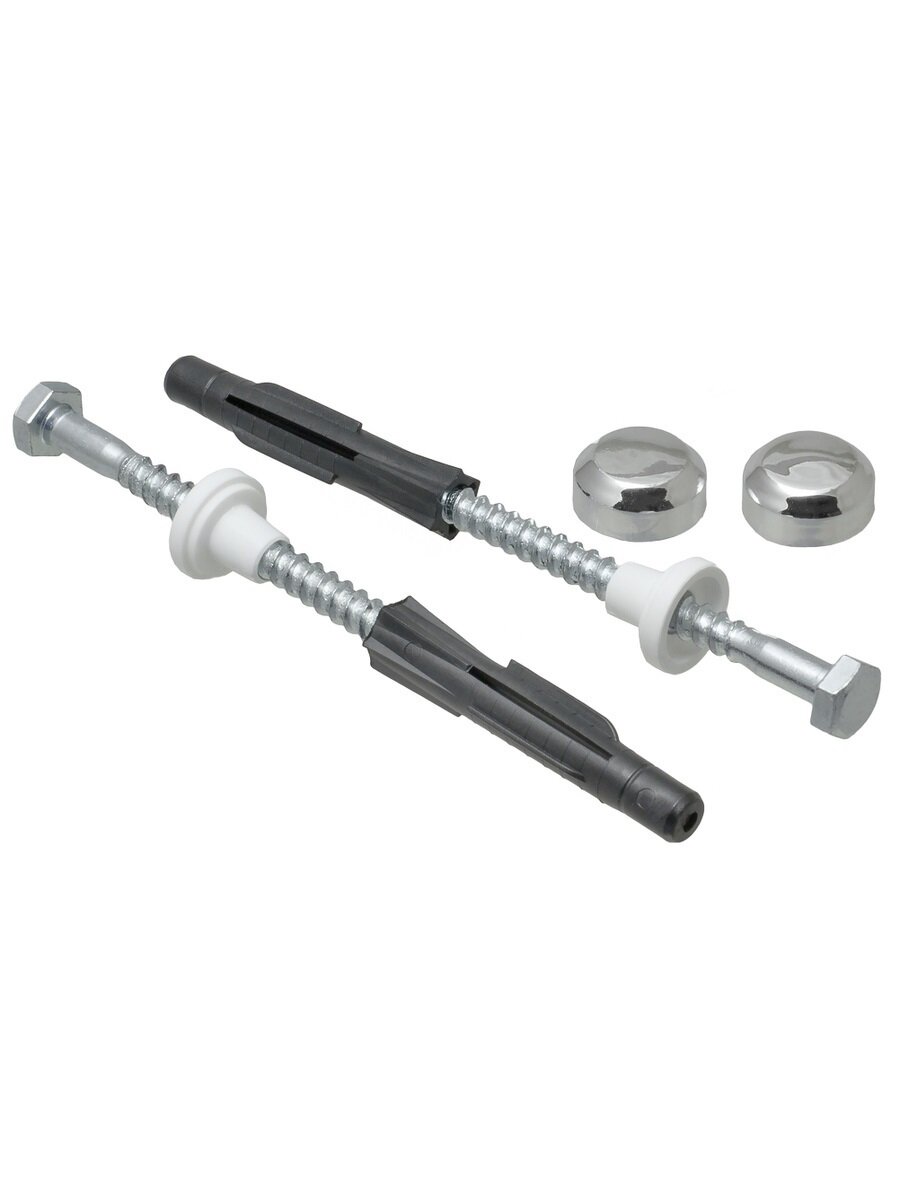 Крепеж унитаза представляет собой комплект метизов, предназначенный для удобного и надежного крепления унитаза к деревянному и каменному полу. Крепеж укомплектован двумя оцинкованными шурупами длиной 70 мм, удобными для силового закручивания гаечным ключом или головкой. Хромированные пластиковые заглушки кроме декоративной функции смягчают нагрузку от шурупов и предохраняют (нижняя часть заглушки) унитаз от трещин при закручивании. Два дюбеля диаметром 10 мм и длинной 50 мм. предназначены для крепления к каменным полам.