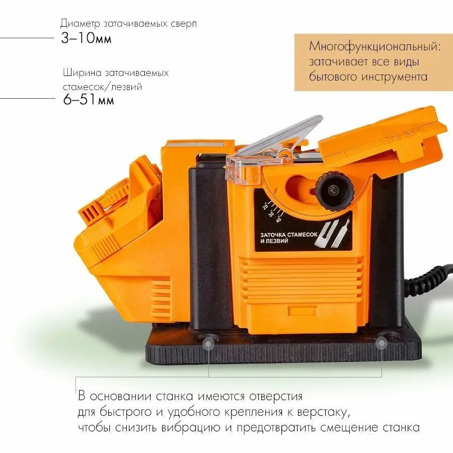 | Особенности | диаметр затачиваемых сверл:3 — 10 мм, ширина затачиваемых стамесок/лезвий:6 — 51 мм. |