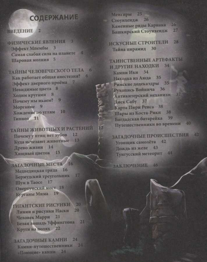 Замечательная маленькая энциклопедия про загадочные явления и тайны. На каждой странице есть красивые картинки и определённый текст, рассказывающий про ту или иную загадку, начиная с физических явлений и заканчивая тунгусским метеоритом. В книге описаны многие интересные, необъяснимые и объяснимые таинственные вещи, которые всегда занимали умы человека. Книга подойдет как взрослым, так и детям