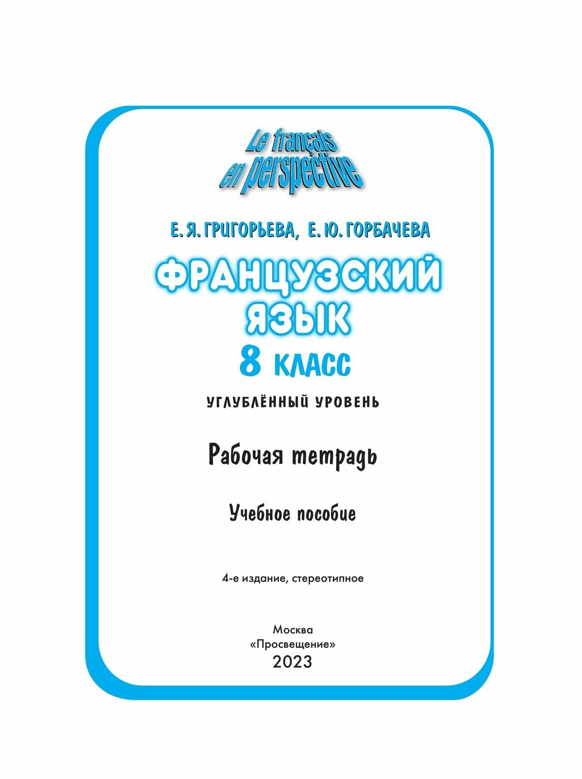 Французский язык. 8 класс. Рабочая тетрадь. Углубленное изучение (Григорьева Елена Яковлевна; Горбачева Екатерина Юрьевна); Просвещение, 2019