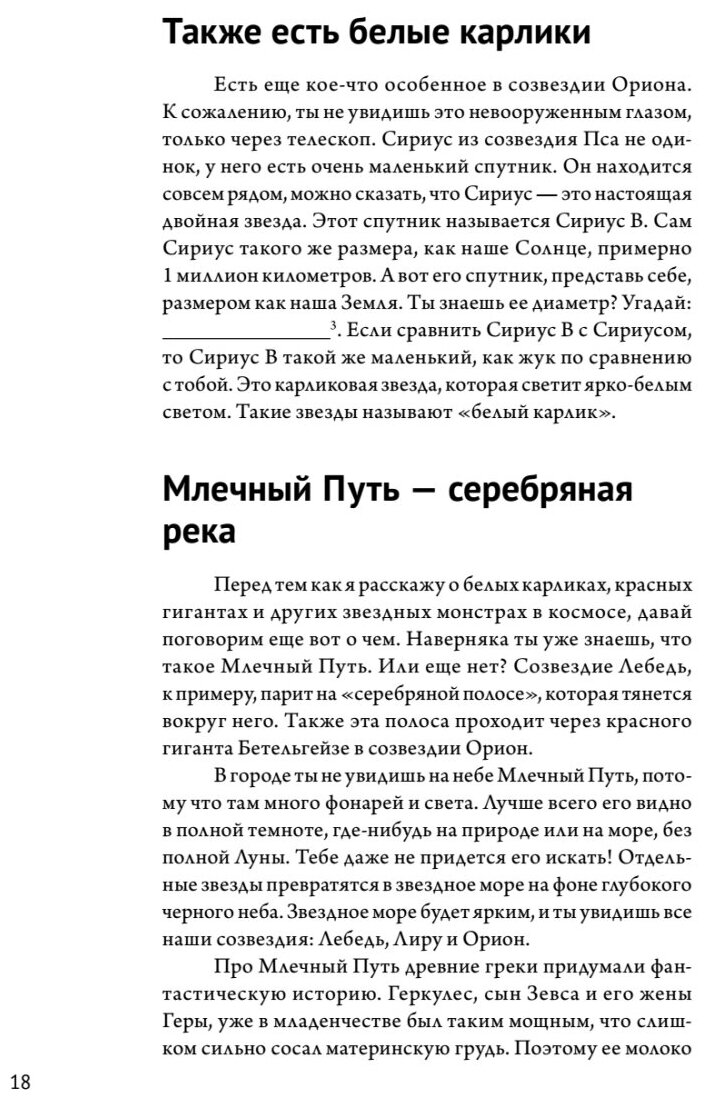 Познавательная книга об астрономии для чтения детям от 9-10 лет. Написано все простым языком, последовательно излагаются основные понятия. Старший сын прочитал уже половину, доволен, нравится. Темы строятся на интересных вопросах и ответах на них: какая звезда ближе всего? Самая известная комета, северное сияние, квазары, пульсары и т.д.