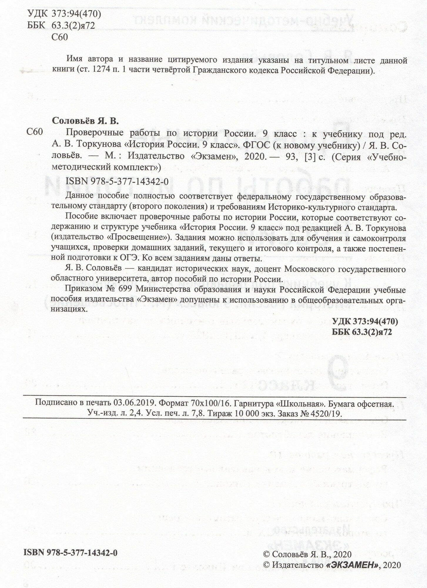 УМК. ПРОВ.РАБ.ПО ИСТОРИИ РОССИИ. 9 КЛ. ТОРКУНОВ. (к новому учебнику) (Соловьев Ян Валерьевич); Экзамен, 2020