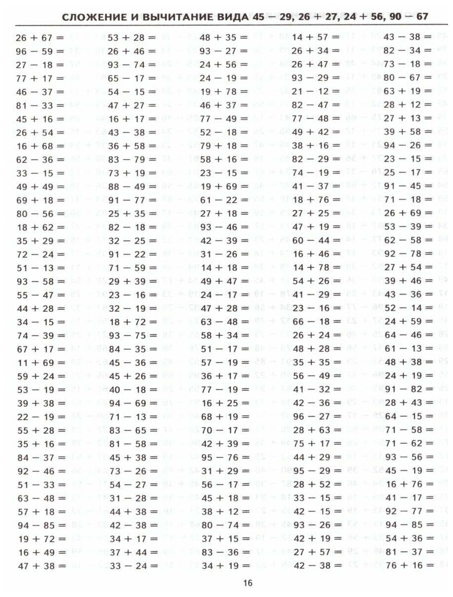 - сложение и вычитание вида 45 - 29, 26 + 27, 24 + 56, 90 - 67: 14 страниц примеров;
