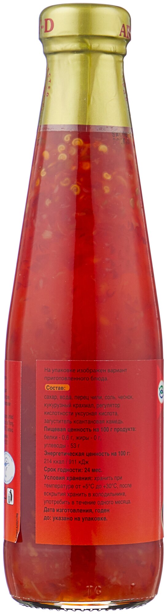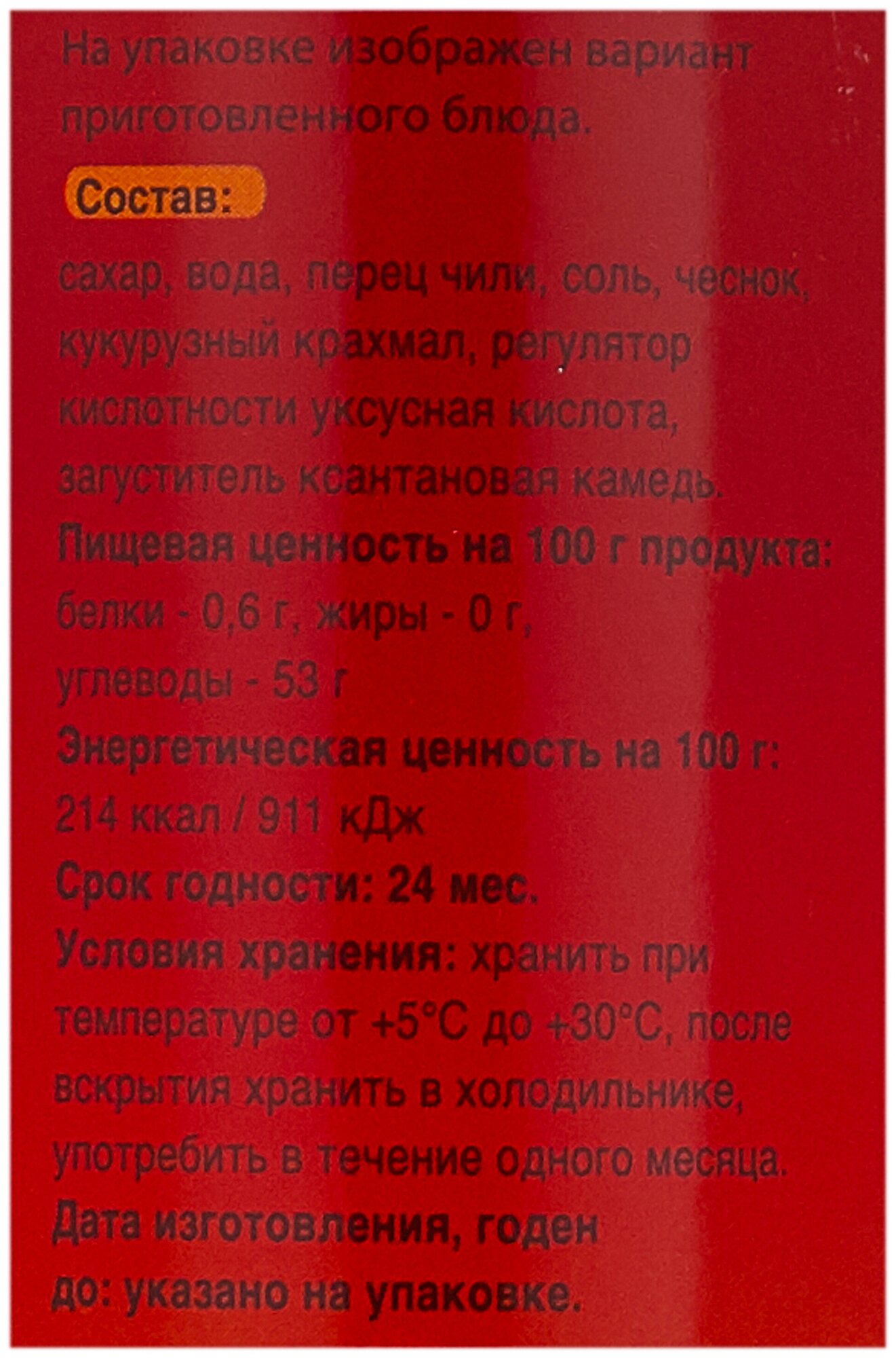 | Состав | сахар, вода, перец чили 22%, соль, чеснок, загуститель-дикрахмаладипат ацетилированный, регулятор кислотности-уксусная кислота ледяная, загуститель-ксантановая камедь |
