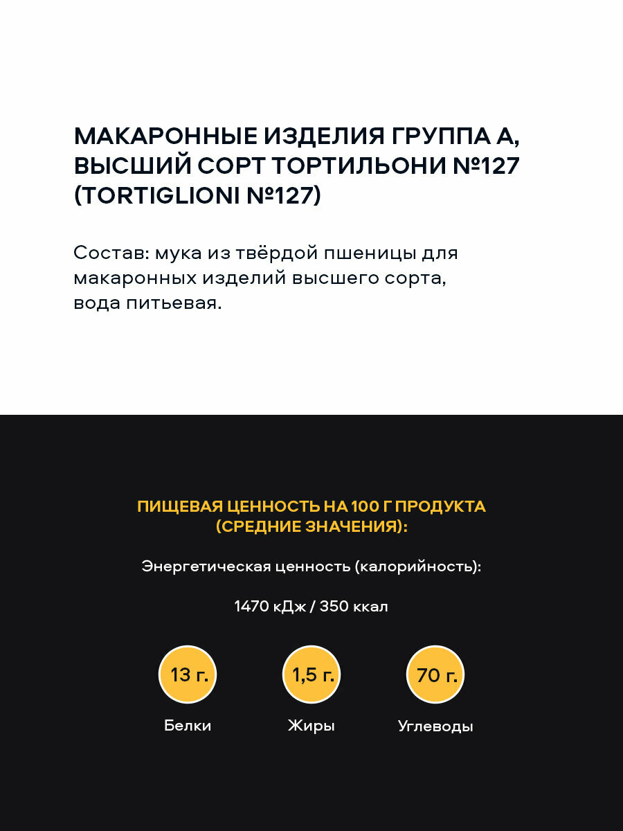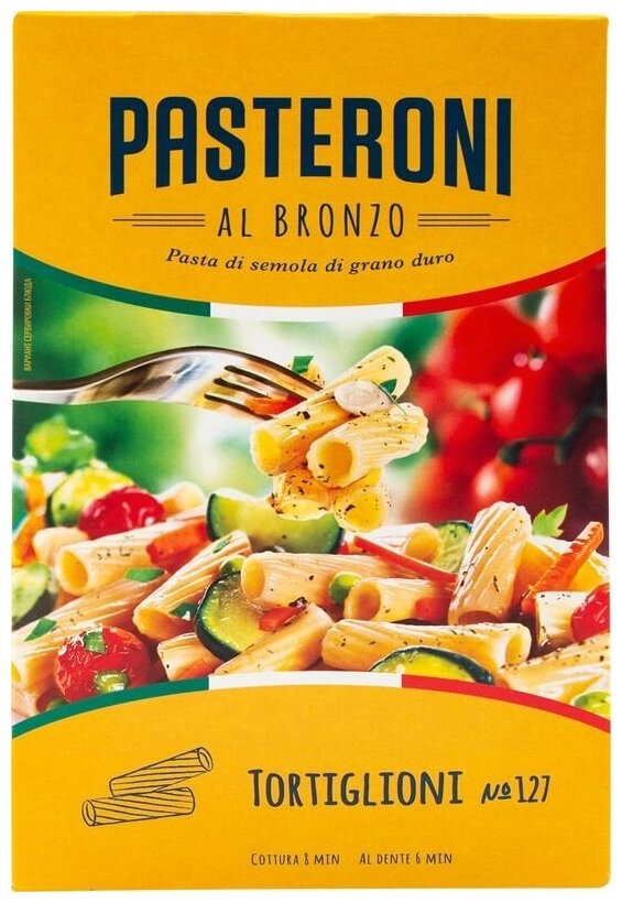 Макароны Pasteroni Tortoglioni 127 400г высококачественная паста, которую производят по тщательно выверенной итальянской технологии с использованием бронзовых матриц. В основе рецептуры отборная крупка, приготовленная из 100% твердой пшеницы. Тесто замешивается на холодной воде, поэтому макаронные изделия остаются упругими в процессе варки. Тортильони по внешнему виду напоминают небольшие полые трубочки. Они обладают шероховатой текстурой и ребристой поверхностью, поэтому прекрасно впитывают и удерживают соусы. На упаковке указаны 2 варианта варки: привычный для российского потребителя и al dente (что в переводе с итальянского означает на зубок). Подавайте макароны в качестве гарнира или используйте для приготовления основных блюд.