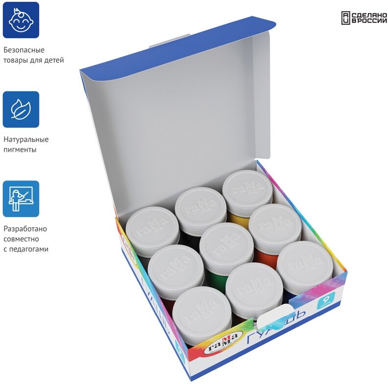 Гуашь серии «Классическая» предназначена для творческих занятий с детьми в школе и дома. Краски производятся на основе качественного прозрачного связующего вещества, которое обеспечивает чистоту цветов. Гуашь плотная, укрывистая, хорошо смешивается и равномерно наносится практически на любую основу. После высыхания создаёт бархатистый матовый красочный слой. В наборе 9 баночек гуаши разных цветов: алый, фиолетовый, жёлтый, коричневый, белый, оранжевый, зелёный, ультрамарин, чёрный. Объём каждой баночки с завинчивающейся крышкой — 20 мл, общий объём — 180 мл. • Количество цветов: 9;• Упаковка: пластиковая баночка с завинчивающейся крышкой;• Объём баночки: 20 мл.