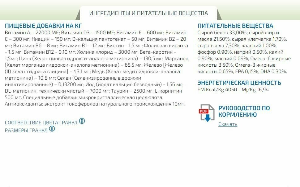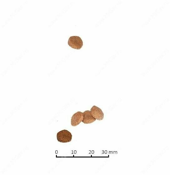 | Состав | Ингредиенты: дегидратированное куриное мясо, рис, животный жир, кукурузный глютен, льняное семя, спельта, гидролизат белков животного происхождения, дегидратированная рыба, пульпа сахарной свеклы, рыбий жир, дегидратированные цельные яйца, волокна гороха, растительное масло, семена подорожника, хлорид калия, сухие пивные дрожжи, инулин (0,6%), фруктоолигосахариды (0,6%), маннанолигосахариды (0,6%), калия хлорид, мононатрия фосфат, сульфат кальция дигидрат, экстракт календулы (источник лютеина). Источник слизистых веществ: семена подорожника. |
