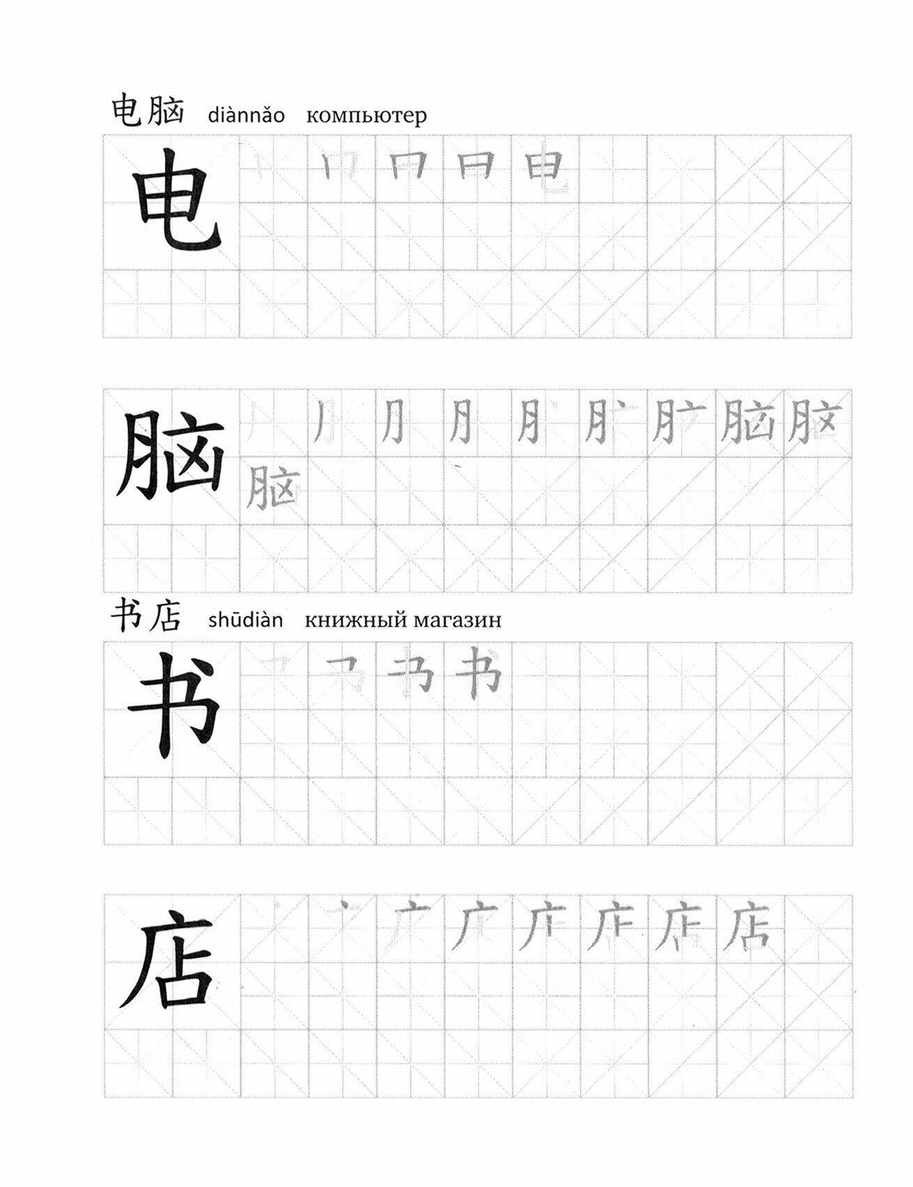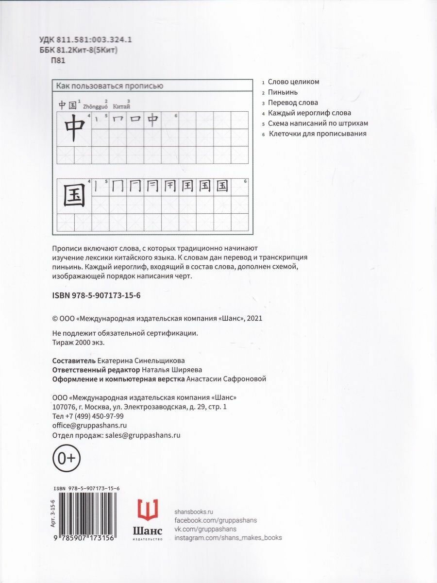 Прописи включают слова, с которых традиционно начинают изучение лексики китайского языка. К словам дан перевод и транскрипция пиньинь. Каждый иероглиф, входящий в состав слова, дополнен схемой, изображающей порядок написания черт.