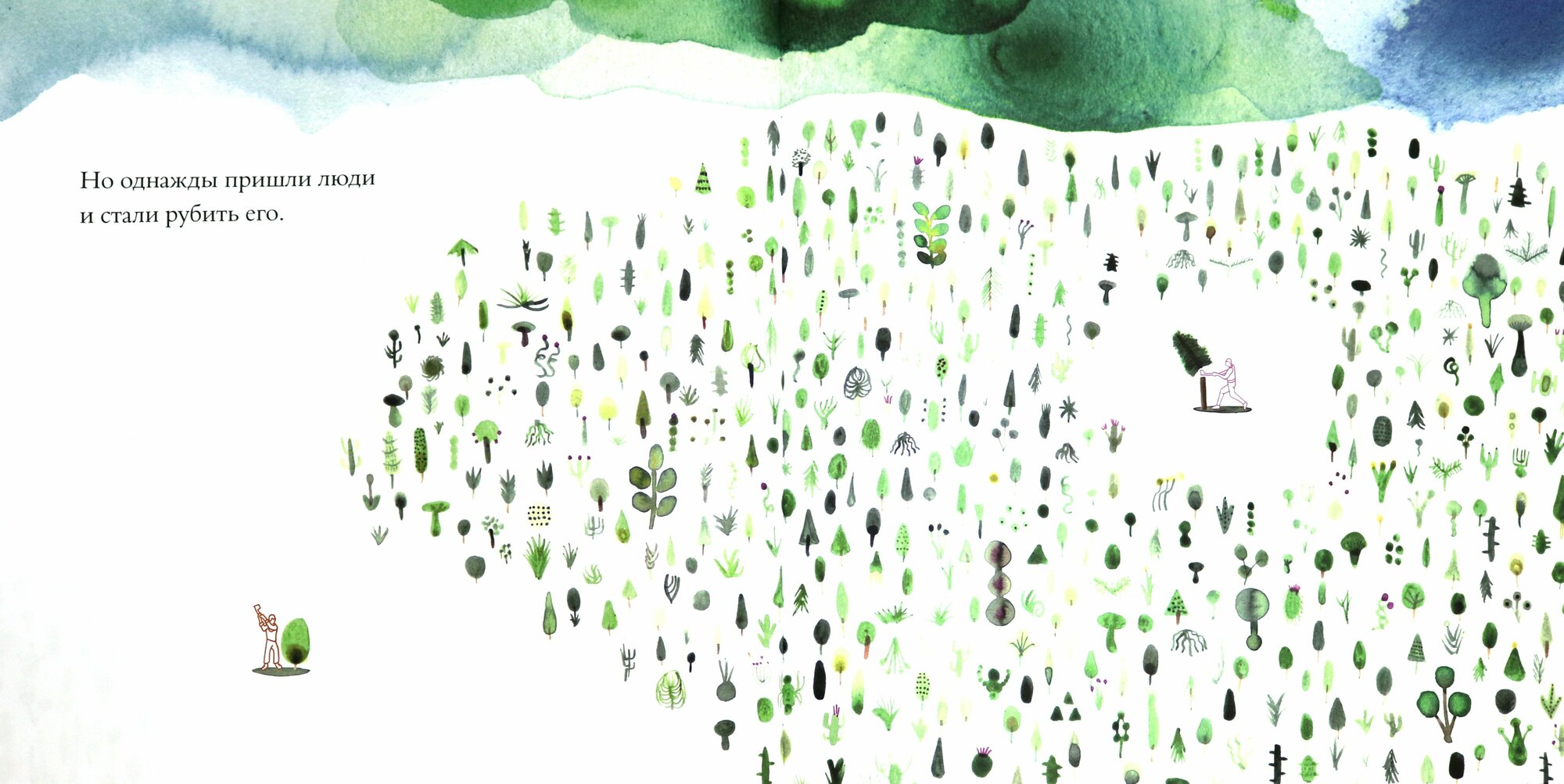 Произведения Марка Мартина - не книги в прямом смысле: в них крайне мало текста, они скорее напоминают невероятно красивые скетч-буки с иллюстрациями, связанными между собой определенной единой идеей, смыслом, который четко проявляется через череду рисунков. Повторюсь, рисунков потрясающей красоты! Прикладываю фотографии нескольких разворотов, Вы только посмотрите на эти цвета, на эту акварель и графику! Вот "Лес", например, через иллюстрации затрагивает очень важную тему экологии, бережного отношения к окружающей среде, отношений человека и природы.