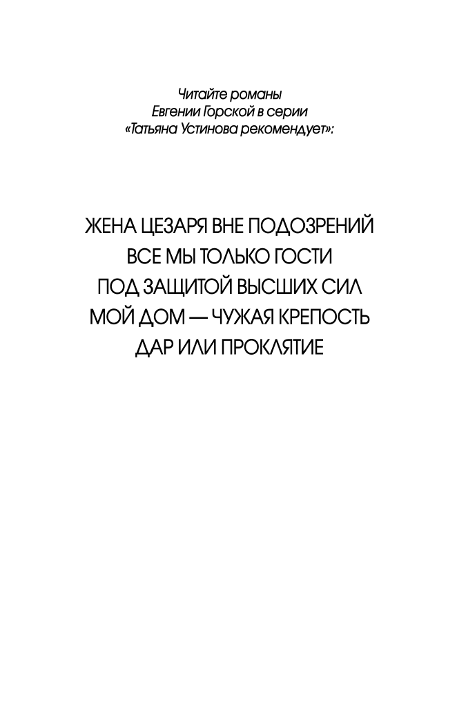 Детективы Евгении Горской открыла для себя не так давно. Интересно читать, сюжет захватывает, не жалко времени, потраченного на чтение, и главное, нет жестокости и грубости в тексте. Большую роль в открытии этого автора сыграли рекомендации Татьяны Устиновой, книги которой я читаю много лет.