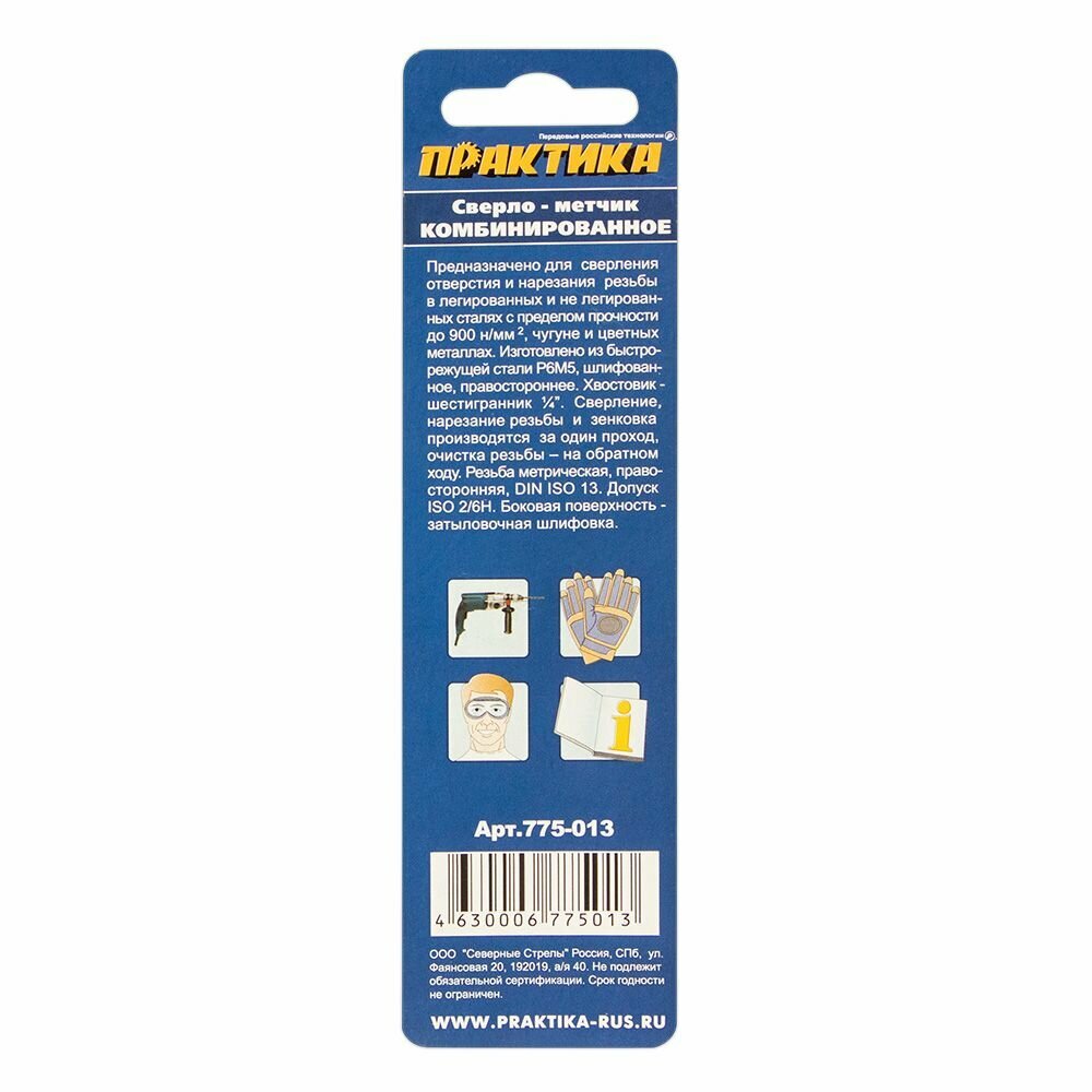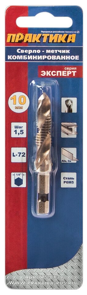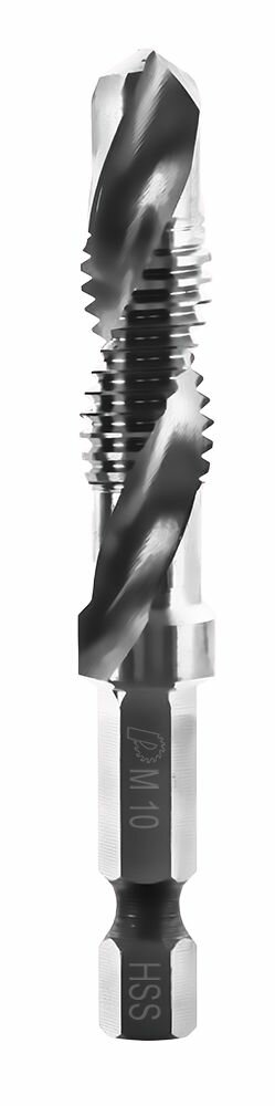Сверло-метчик комбинированное предназначено для сверления отверстия и нарезания резьбы при помощи дрели. Серия Эксперт. Для обработки листовых материалов и профилей из легированных и не легированных сталей с пределом прочности на растяжение до 900 Н/мм2 и цветных металлов. Изготовлено из быстрорежущей стали Р6М5, шлифованное, хвостовик 1/4’’. Сверление, нарезание резьбы и зенковка производится за один рабочий проход, очистка резьбы - на обратном ходу. Резьба метрическая DIN ISO 13, правосторонняя. Допуск ISO 2 / 6Н. Боковая поверхность - затыловочная шлифовка