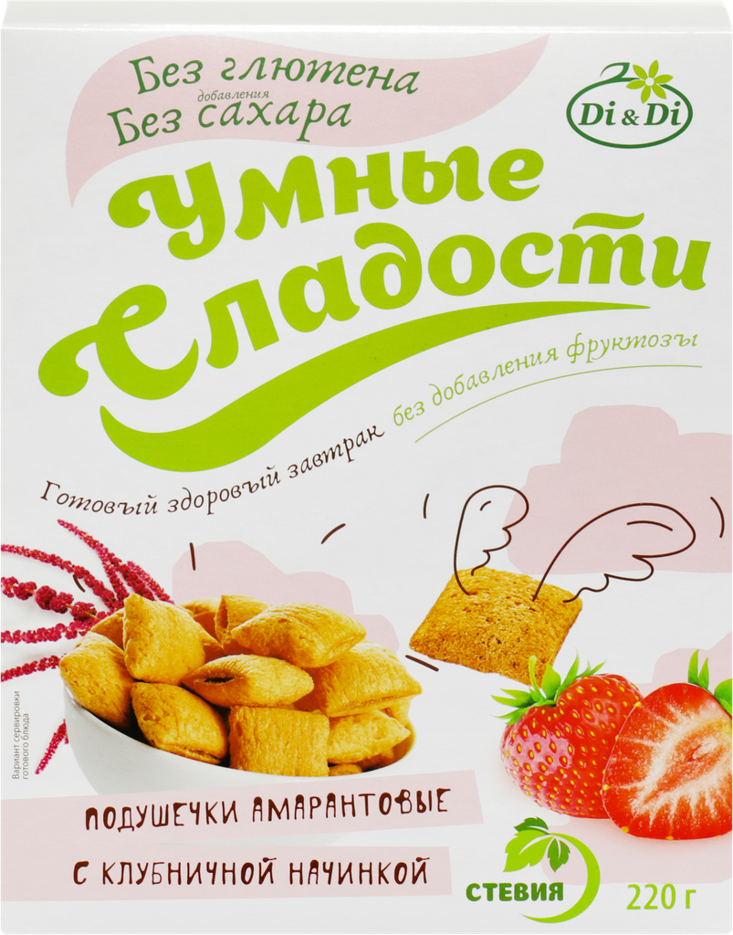 Подушечки Умные сладости c клубничной начинкой - диетический и диабетический продукт нового поколения на основе натуральных растительных компонентов: стевии и амаранта. Подушечки из амарантовой муки - это продукт здорового питания. Амарант - кладезь хорошего сбалансированного и легко усваиваемого растительного белка, витаминов, полинасыщенных жирных кислот омега-3 и омега-6, холина и сквален.