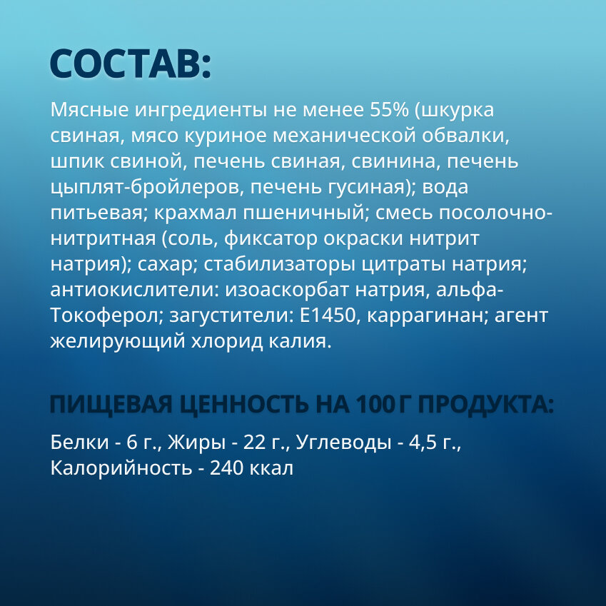 | Состав товара | Мясо птицы, вода, свинина жилованная, шпик свиной, шкурка свиная, соль нитритная (соль пищевая, консервант Е250), крахмал картофельный, специи. |