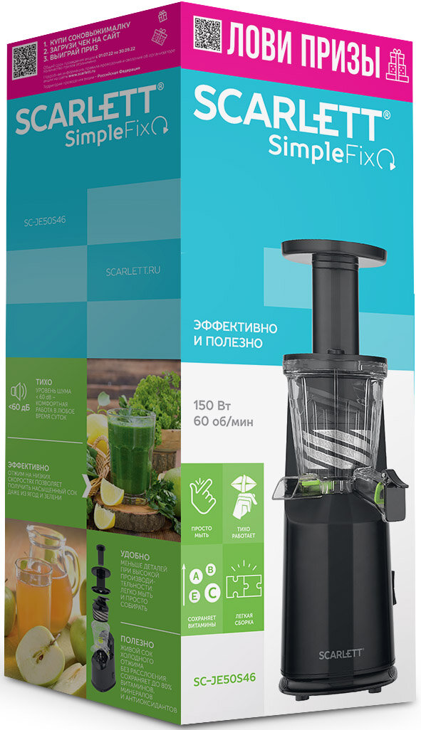 | Прочие особенности и свойства | Шнековая соковыжималка SC-JE50S46 мощностью 150 Вт оснащена функцией реверс! Живой сок холодного отжима без расслоения сохраняет до 80% витаминов, минералов и антиоксидантов. Скорость вращения вала 60 оборотов в минуту, уровень шума < 60 dB обеспечит комфортную работу в любое время суток. Ёмкость для сбора мякоти 550 мл, ёмкость для сбора сока 700 мл и щетка для очистки фильтра в комплеккте! Функция антикапля позабоиится о практичности использования и избавит от нежелательных пятен на рабочем столе. Отжим на низких скоростях позволяет получить насыщенный сок даже из ягод и зелени. Автоматическая блокировка при неправильной сборке обеспечит беопасность эксплуатации. Меньше деталей при высокой производительности: легко мыть и просто собирать! Нейтральное чёрное цветовое решение позволит соковыжималке вписаться практически в любой интерьер. |