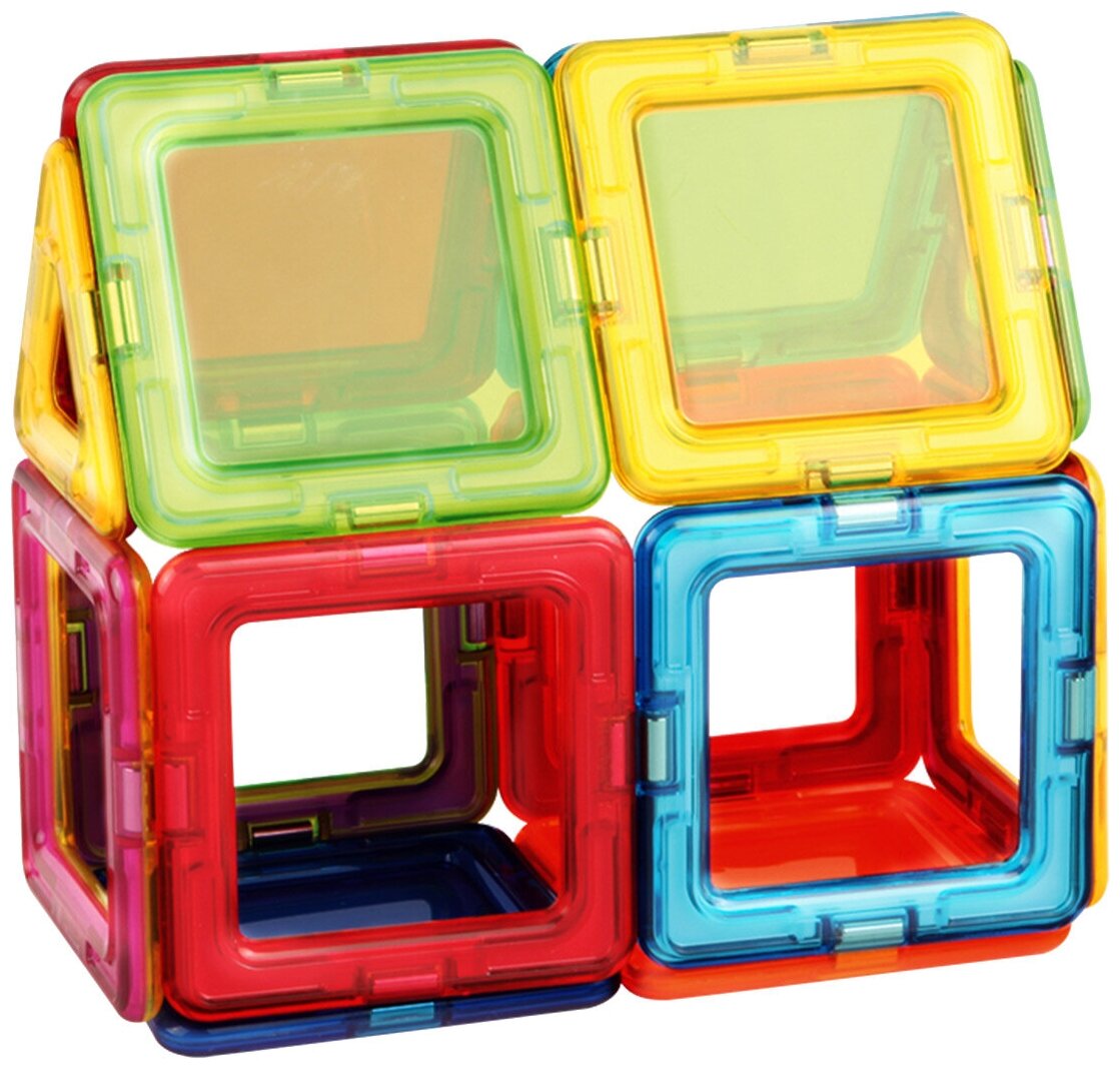 Магниты укреплены внутри деталей особым образом, который позволяет им поворачиваться друг к другу нужной стороной. В результате детали всегда притягиваются, и строить из них легко и удобно. В конструкторе используются самые сильные в мире неодимовые магниты, они повышают прочность построек.