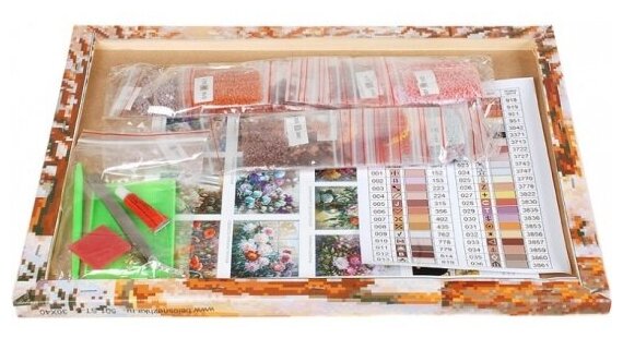 | Комплектация | плотная основа для картины с нанесенной схемой и клеевым слоем, набор алмазных камней, пинцет, лоток для мозаики, инструкция |
