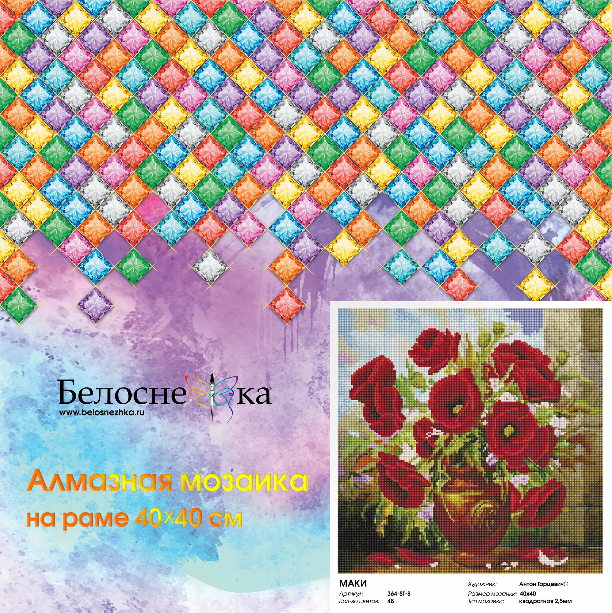 Прекрасные наборы для желающих попробовать себя в новом виде творчества, из полотна получается красивая мерцающая картина с природным сюжетом. Все сюжеты жизненные и авторские, разработаны по картинам современных российских художников. В комплект входят квадратные ограненные акриловые камни, которые расфасованы по цветам, на пакетах имеется наклейка с условным обозначением и номером. На холсте напечатана четкая цветная схема, поверх которой нанесен качественный клеевой слой, сверху клеевой слой защищает прозрачная пленка. Квадратная форма алмазных камней позволяет аккуратно заполнить картину и без единого пробела. Техника алмазной мозаики достаточно проста и увлекательна. Готовую работу можно смело ставить в раму и вешать на стену. В солнечный день алмазная мозаика вас прекрасно удивит своим блеском и переливанием. Размер: 40/40. Количество цветов: 48. Тип выкладки: 100% заполнение. Форма камней: квадратные 2,5*2,5 мм, 9 и 13 граней.