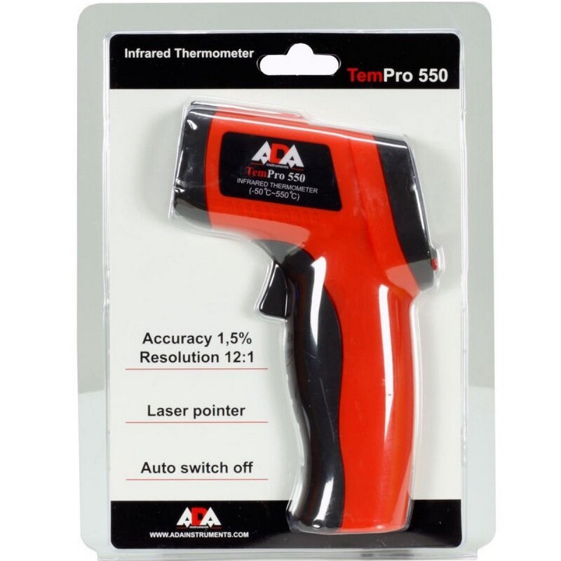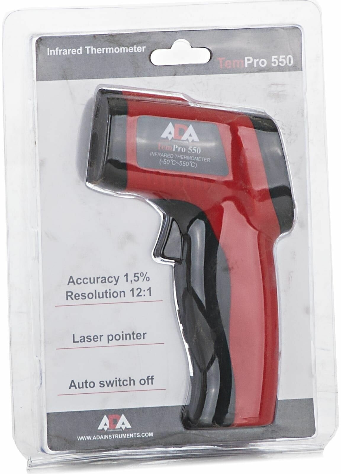 Инфракрасный пирометр ADA TemPro 550 предназначен для дистанционного измерения температуры (не подходит для измерения температуры человека). Прибор питается от аккумуляторной кроны 9 В.
