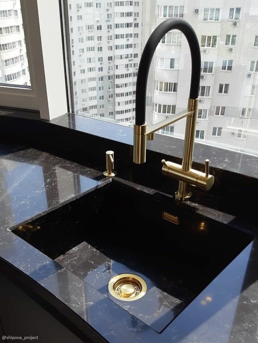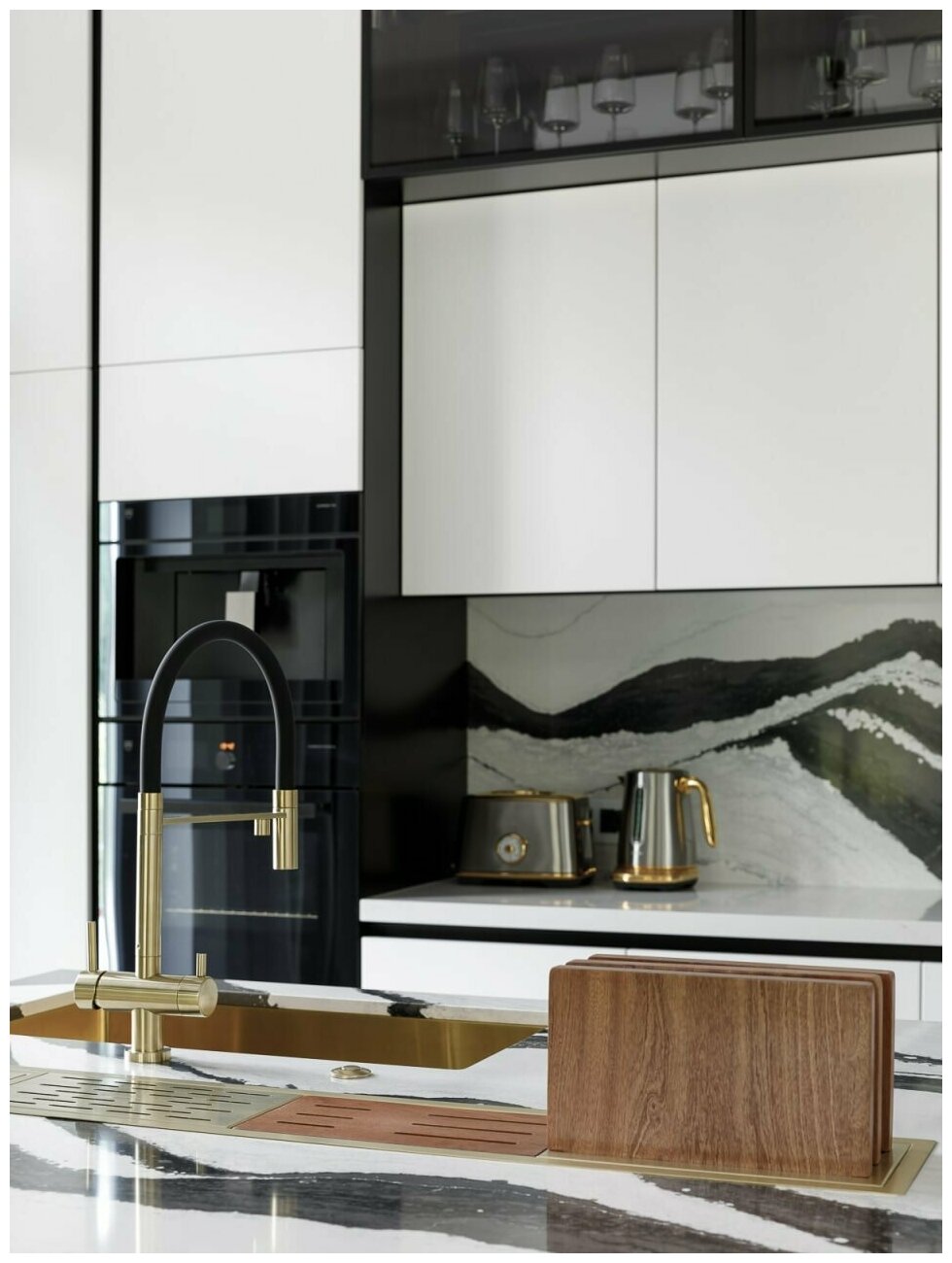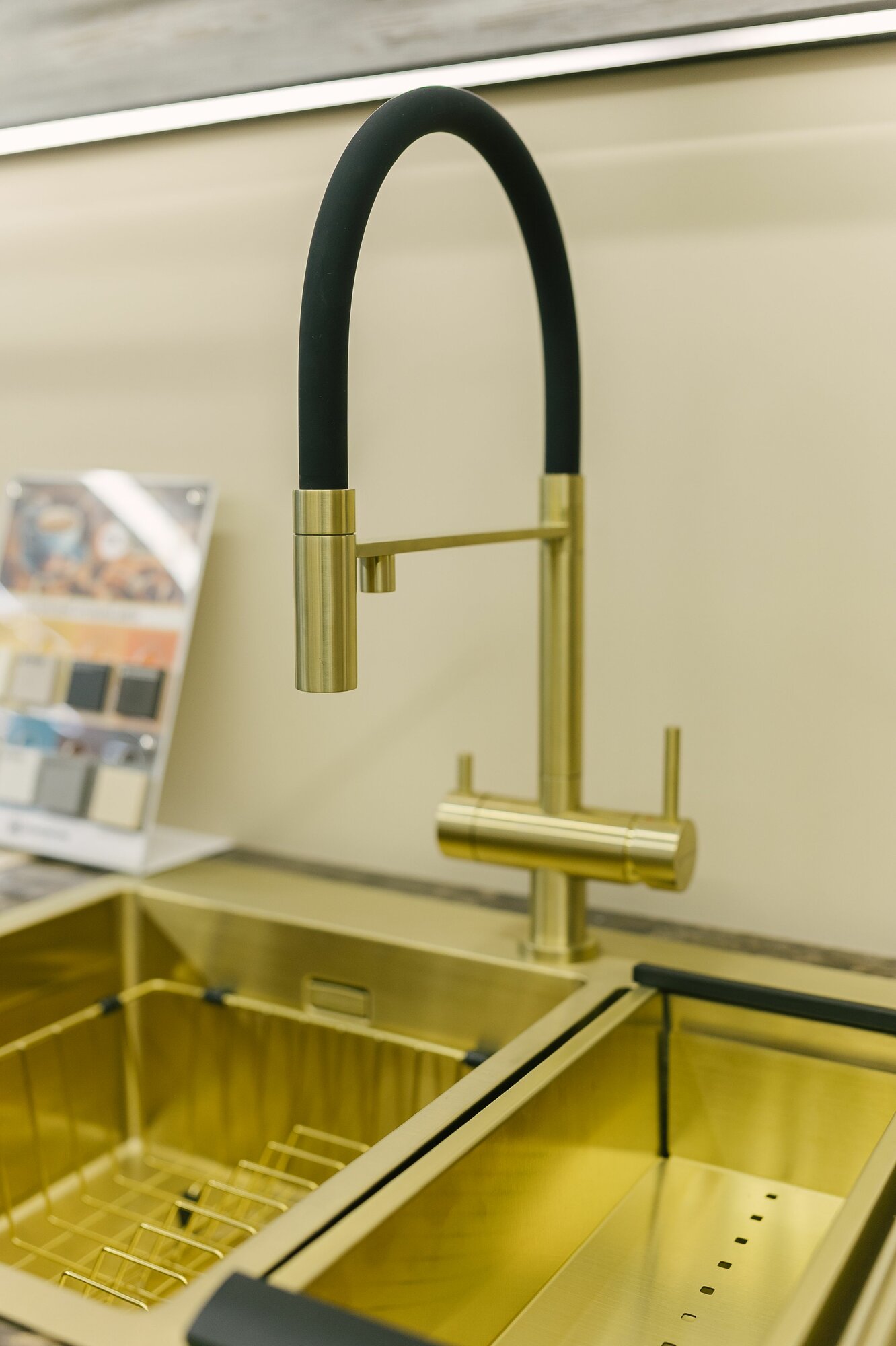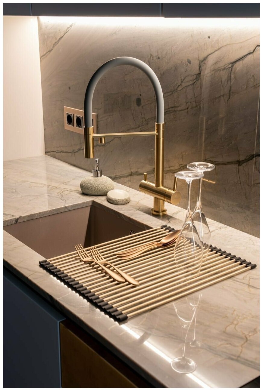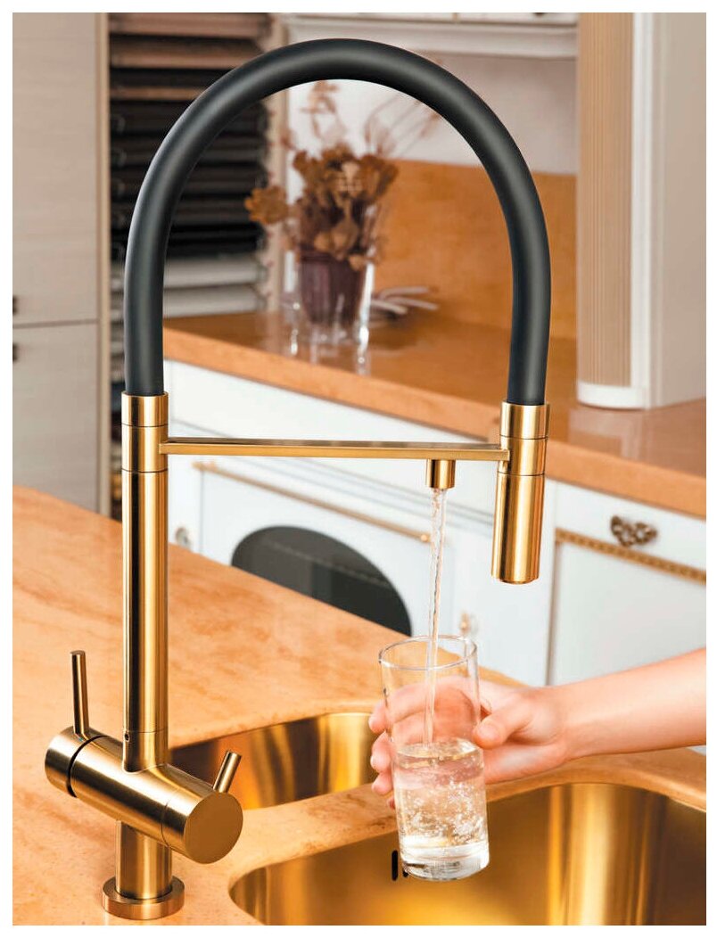 Смеситель для кухни Omoikiri Kanto LG 4994014. Цвет: светлое золото/черный. Стильный и удобный в использовании смеситель подходит для большинства кухонных интерьеров в современном стиле. Обладает уникальной запатентованной конструкцией - сочетанием гибкого шланга и подачи фильтрованной воды. Изготовлен из высококачественной латуни с покрытием под искусственный гранит, устойчивым к царапинам и потускнению.