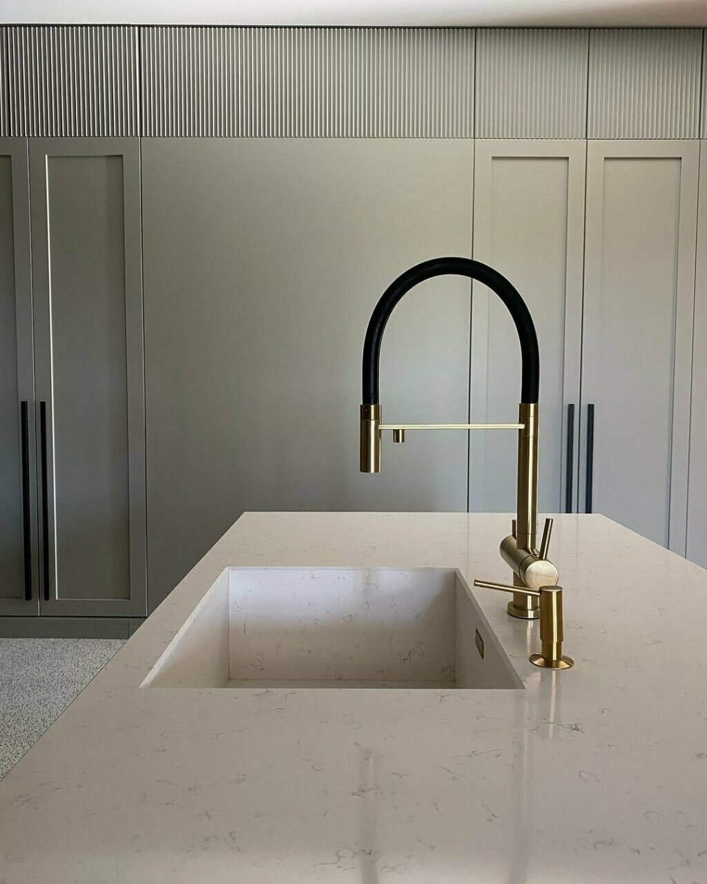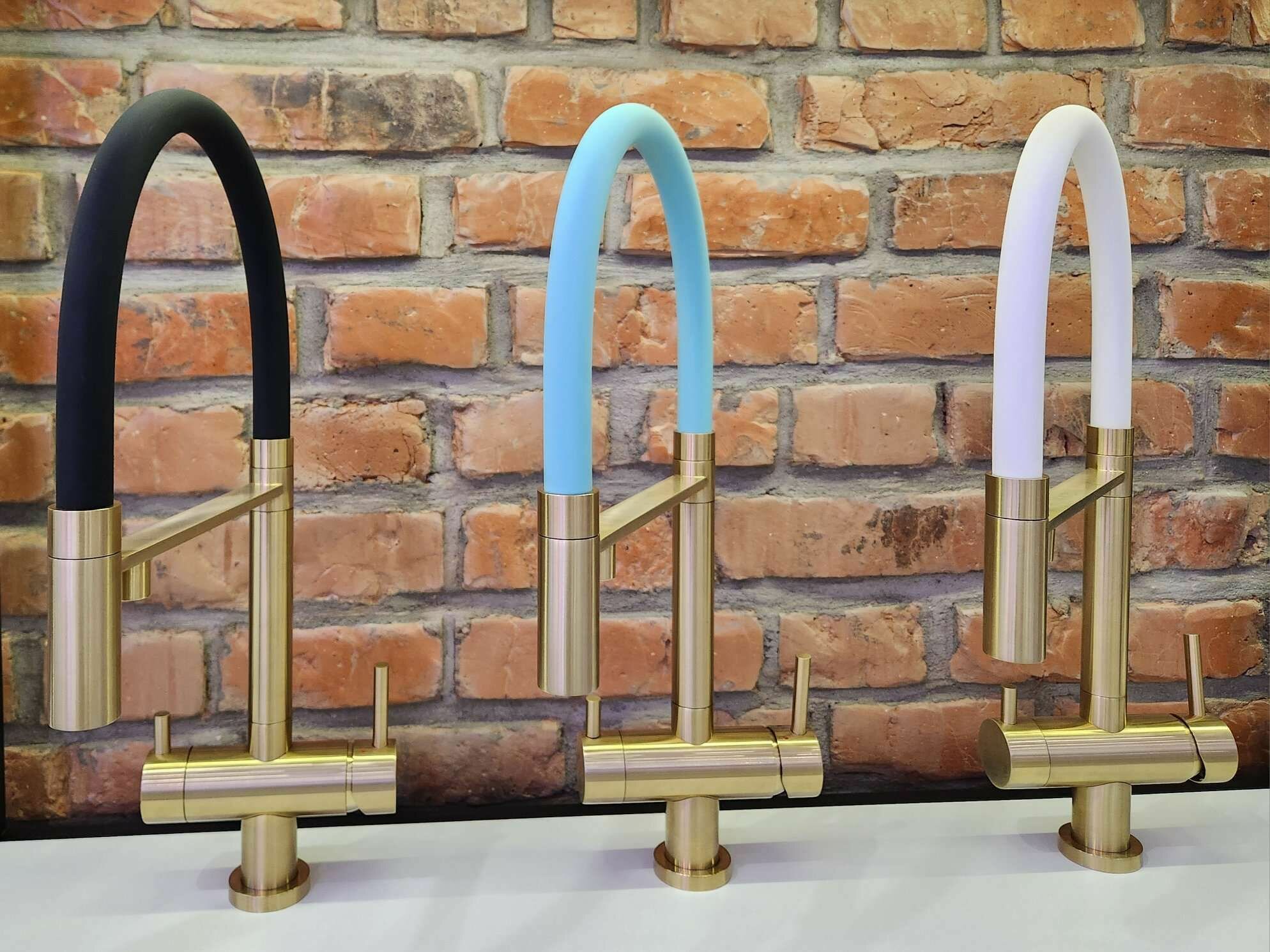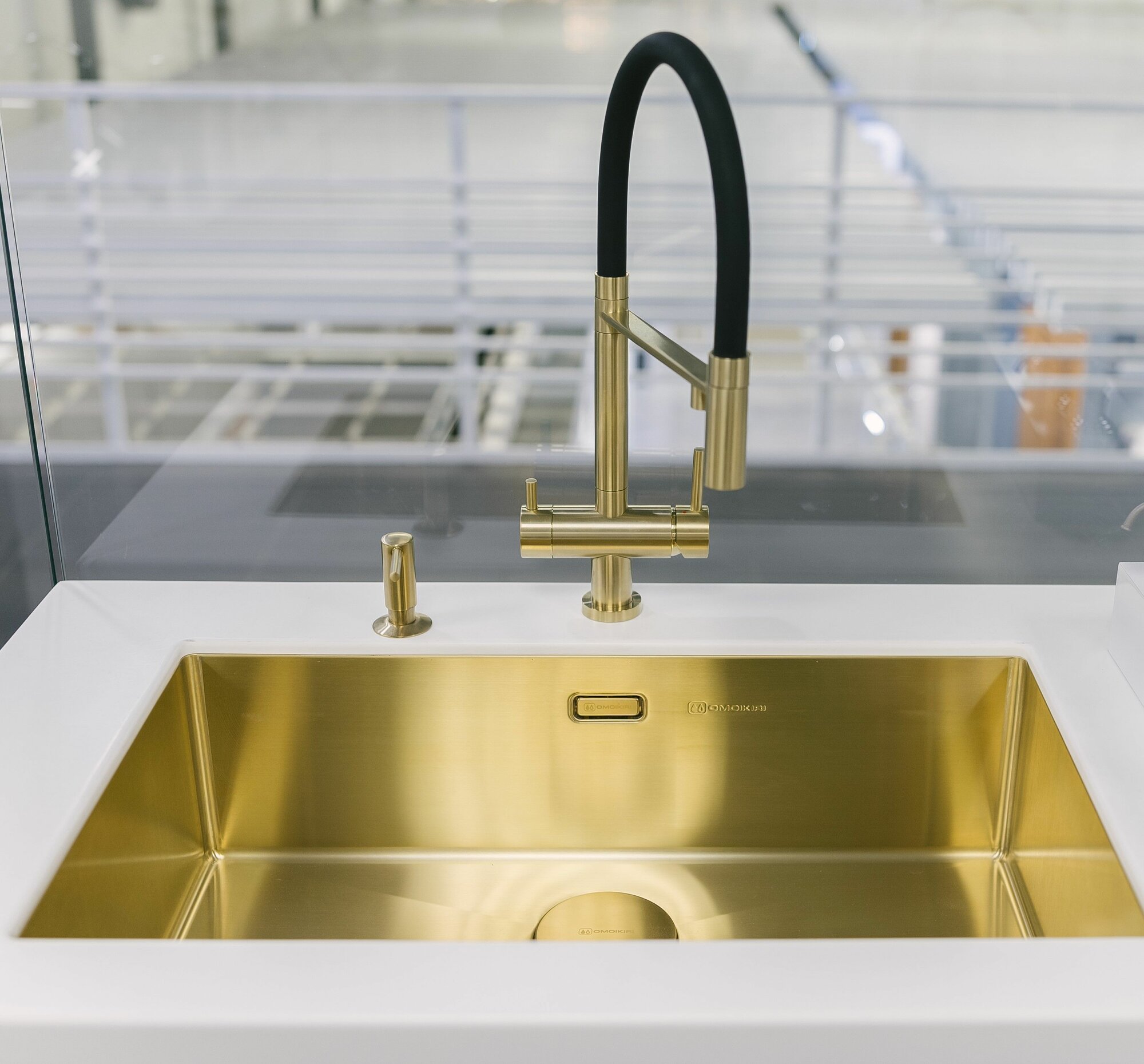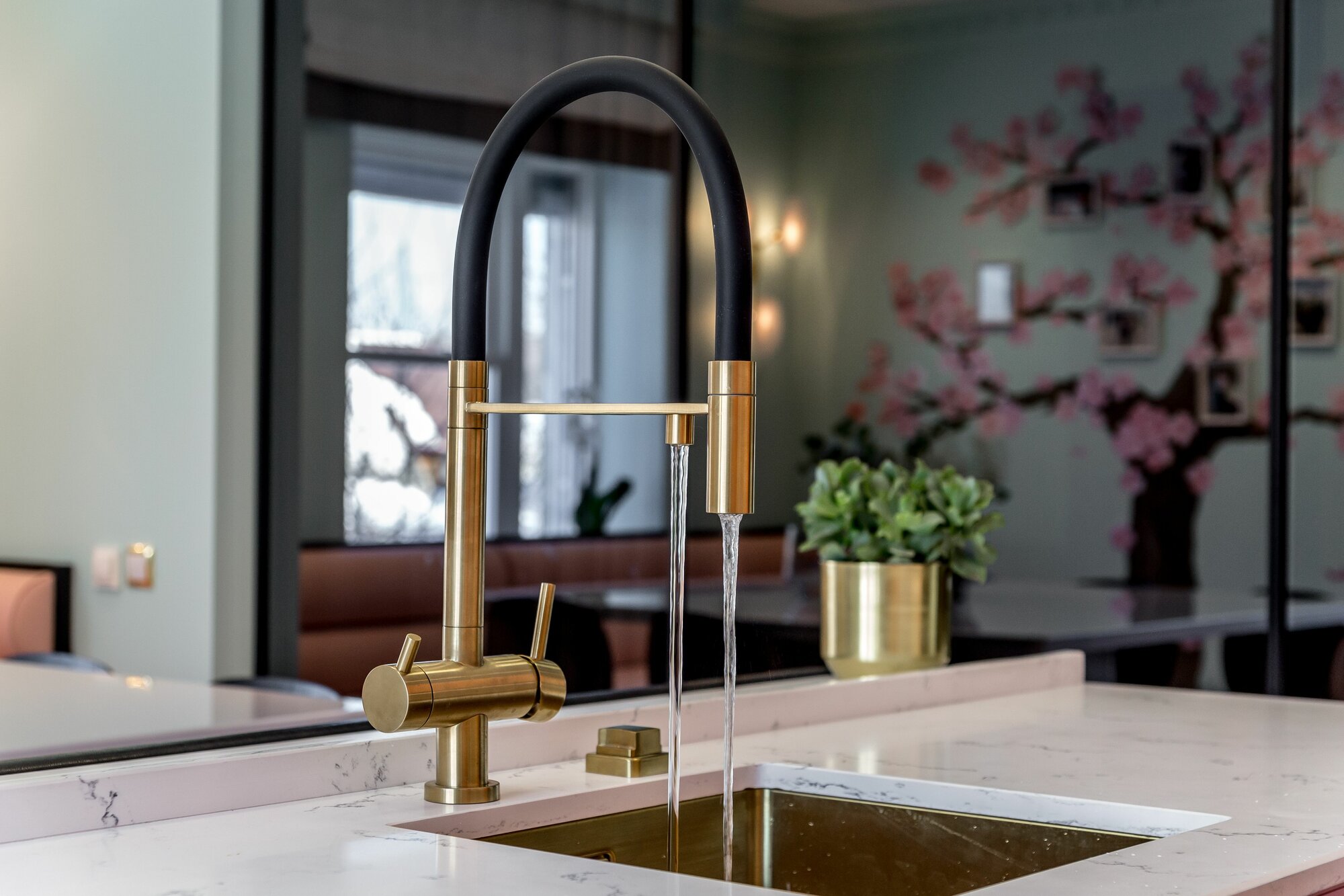 Смеситель для кухни Omoikiri Kanto LG 4994014. Цвет: светлое золото/черный. Стильный и удобный в использовании смеситель подходит для большинства кухонных интерьеров в современном стиле. Обладает уникальной запатентованной конструкцией - сочетанием гибкого шланга и подачи фильтрованной воды. Изготовлен из высококачественной латуни с покрытием под искусственный гранит, устойчивым к царапинам и потускнению.