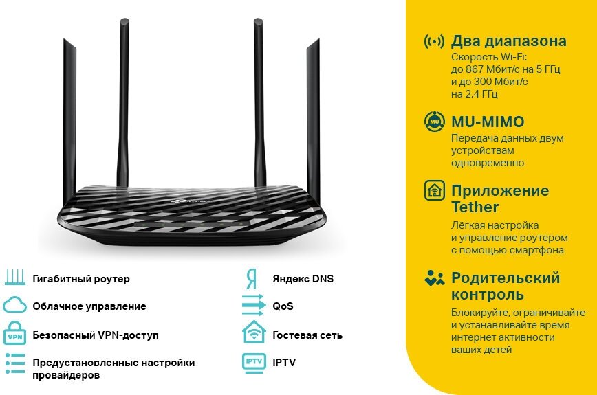 | Дополнительная информация | Поддержка стандарта Wi-Fi 802.11ac,Общий объём пропускной способности до 1,2 Гбит/с:до 867 Мбит/с на 5 ГГц и до 300 Мбит/с на 2,4 ГГц,4 внешние и 1 встроенная антенна для стабильного соединения и оптимального покрытия сети,Лёгкое управление сетью с помощью приложения TP-LINK Tether,MU-MIMO увеличивает производительность роутера в 2 раза, передавая данные 2 устройствам одновременно,Поддержка режима точки доступа,Поддержка технологии Beamforming |