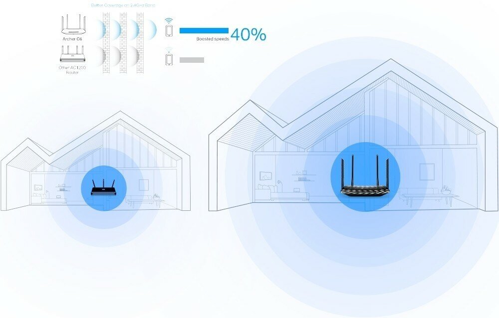 до этого, в течении года пользовался другим роутером, который прибрел ранее именно из за возможности подключения по сети 5ГГц. К сожалению указанным диопазоном воспользоваться в полной мере не смог из-за весьма малой зоны покрытия. Так в однокомнатной квартире на расстоянии 6 метров от роутера скорость передачи данных падала настолько, что комфортнее было пользоваться подключением 2.4 ГГц. По данной причине приобрел роутер TP-Link Archer A6 и скажу, что разница в роутерах заметна стала сразу. В моей однушке (40 кв.м), по сети 5 ГГц, и тарифном плане 50мб/с, при замерах показывает 69мб/с, причем независимо от того на каком расстоянии находится устройство от роутера, в комнате рядом с ним или на балконе через две стены. Пользуюсь всего в течении суток, в связи с чем делюсь своими первыми впечатлениями, на данном этапе проблем не ощущаю. Покупал именно для дома, лишние примочки в роутере мне не нужны, необходим лишь был стабильный сигнал при подключении 5ГГц, в связи с чем данный роутер мне пришелся по душе и о покупке не жалею.