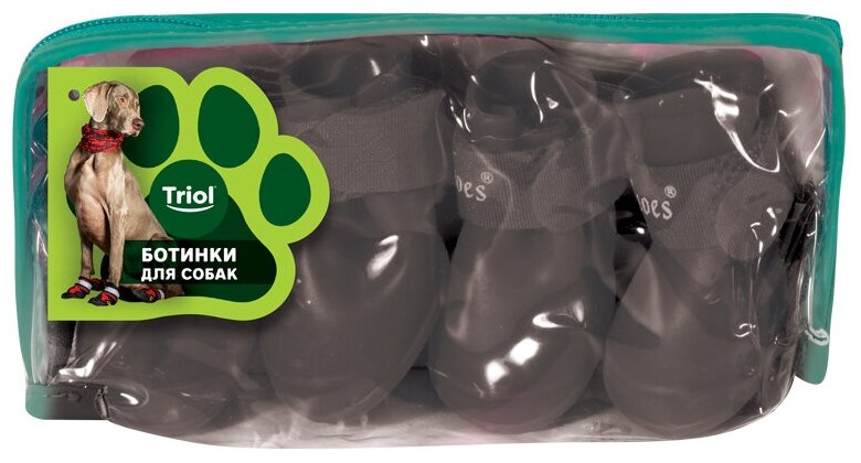 Стильный комплект резиновых сапожек для собак - незаменимый аксессуар индивидуальной защиты лап животного от воздействия агрессивных жидкостей, дорожных химреагентов, бензинов и масел на проезжей части дорог. Прочные, комфортные и непромокаемые, они сохраненяют лапы собаки чистыми и сухими в ненастную погоду и защищают их от истирания о твердое покрытие при длительных и интенсивных нагрузках. Сапоги надежно фиксируются на лапе с помощью липучек. Снятие мерок (при измерении длины стопы необходимо учесть длину когтей):Поставьте лапу собаки на лист бумаги и обведите карандашом стопу.Замерьте получившуюся окружность по длине и ширине стопы. Triol Сапожки для собак Размеры длина (мм) ширина (мм) высота (мм) Размер L 55 мм 45 мм 55 мм
