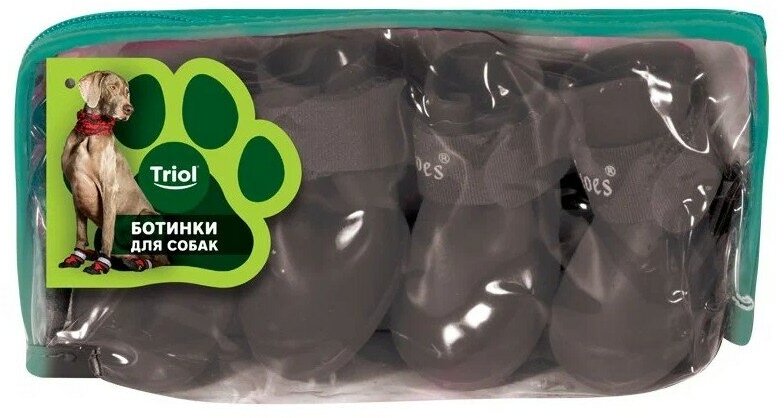 Стильный комплект резиновых сапожек для собак - незаменимый аксессуар индивидуальной защиты лап животного от воздействия агрессивных жидкостей, дорожных химреагентов, бензинов и масел на проезжей части дорог. Прочные, комфортные и непромокаемые, они сохраненяют лапы собаки чистыми и сухими в ненастную погоду и защищают их от истирания о твердое покрытие при длительных и интенсивных нагрузках. Сапоги надежно фиксируются на лапе с помощью липучек. Снятие мерок (при измерении длины стопы необходимо учесть длину когтей):Поставьте лапу собаки на лист бумаги и обведите карандашом стопу.Замерьте получившуюся окружность по длине и ширине стопы. Triol Сапожки для собак Размеры длина (мм) ширина (мм) высота (мм) Размер M 50 мм 40 мм 50 мм