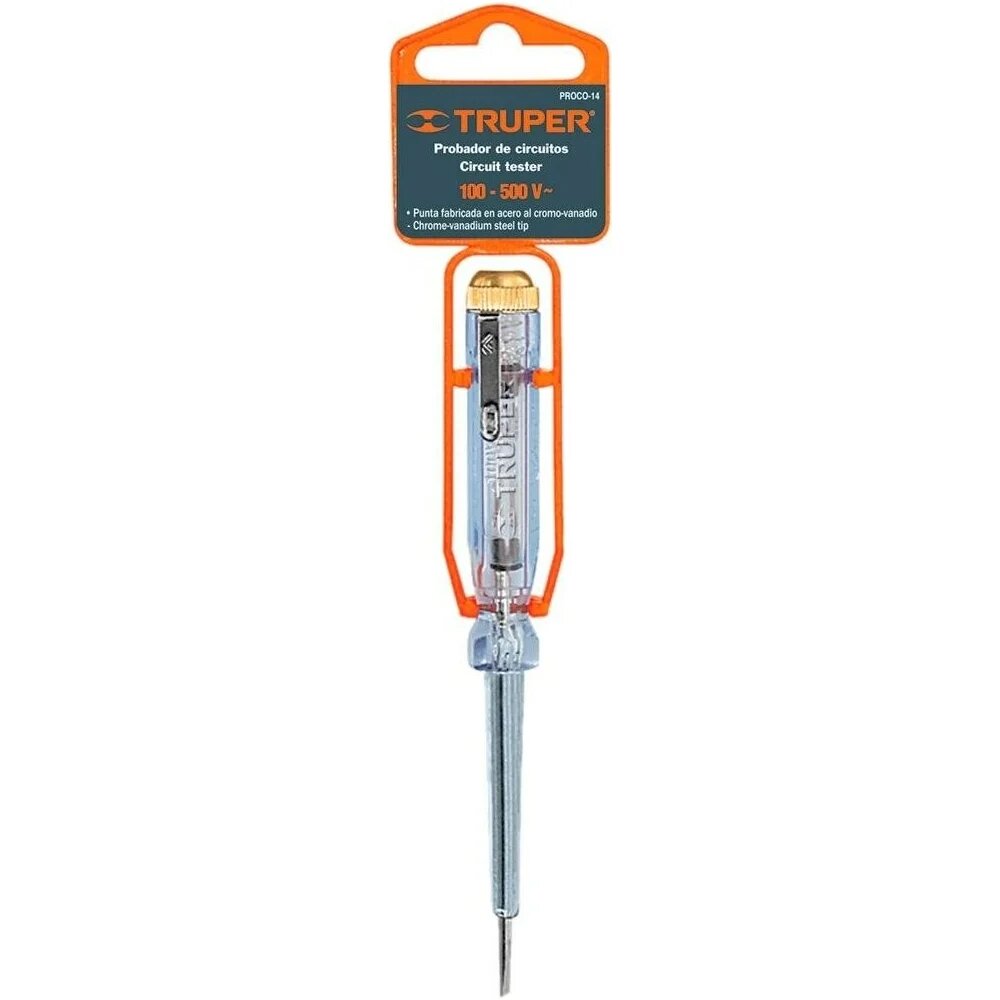 На рукоятке отвертки-тестера Truper расположен зажим для удобства крепления к карману спецодежды рабочего. Таким образом инструмент всегда находится под рукой.