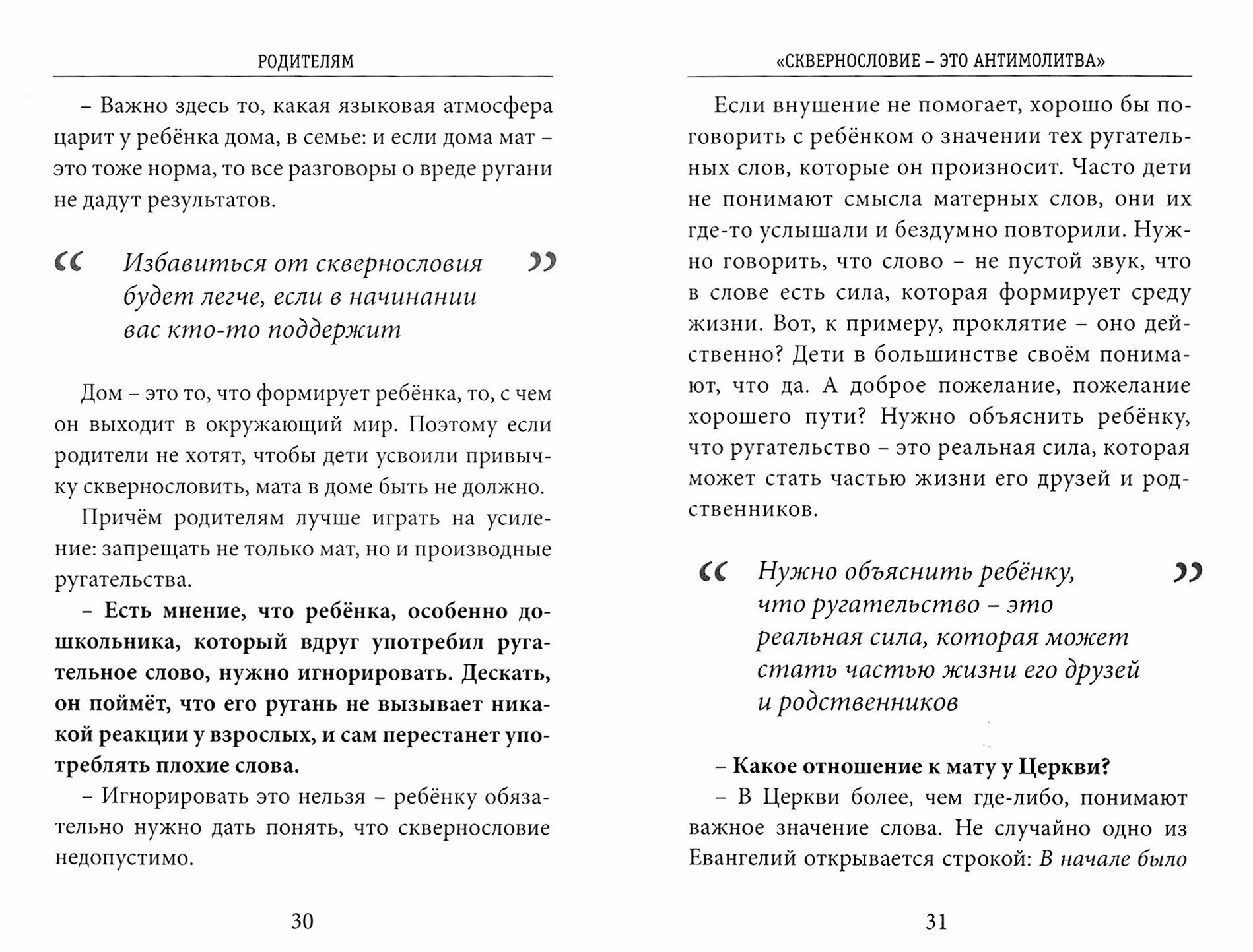 Очень нужная, своевременная книга. Действительно, все понимают, что нецензурная лексика вредна и разрушительна, но мало кто задумывается, почему. Эта книга объясняет происхождение матерных слов, их "нелегальное" существование в русской культуре на протяжении многих веков и нынешнюю тяжелую ситуацию, когда мат практически легализован во всех слоях общества. В книге приводятся конкретные примеры из жизни о негативных последствиях греха сквернословия. Спасибо издателям!