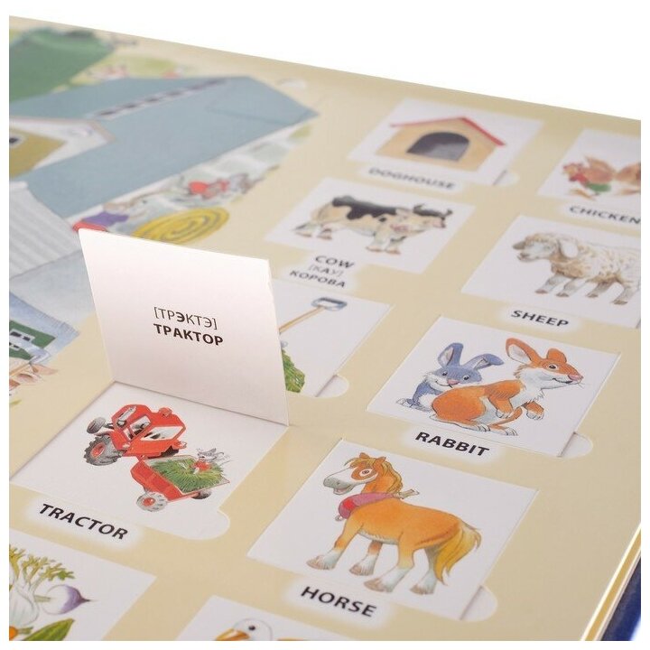 Как учить малышей английскому языку? В игре! Разглядывая картинки и открывая окошки, малыш освоит первые английские слова, которые непременно пригодятся ему в школе. Произношение передано русскими буквами.