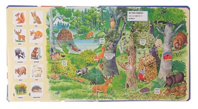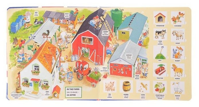 Красивая большая, качественная книга. Дочке 4г сразу пришлась по душе. Интерес к английскому подогрет любопытством, а что там в окошке. Получается хороший диалог между мамой и ребенком на англиском. Советую приобрести. Хотелось бы еще купить такого плана, но не нашлось. Вопрос вызвало только одно окошко. Tree - открываешь, а там деревянная мебель, почему тогда не wood