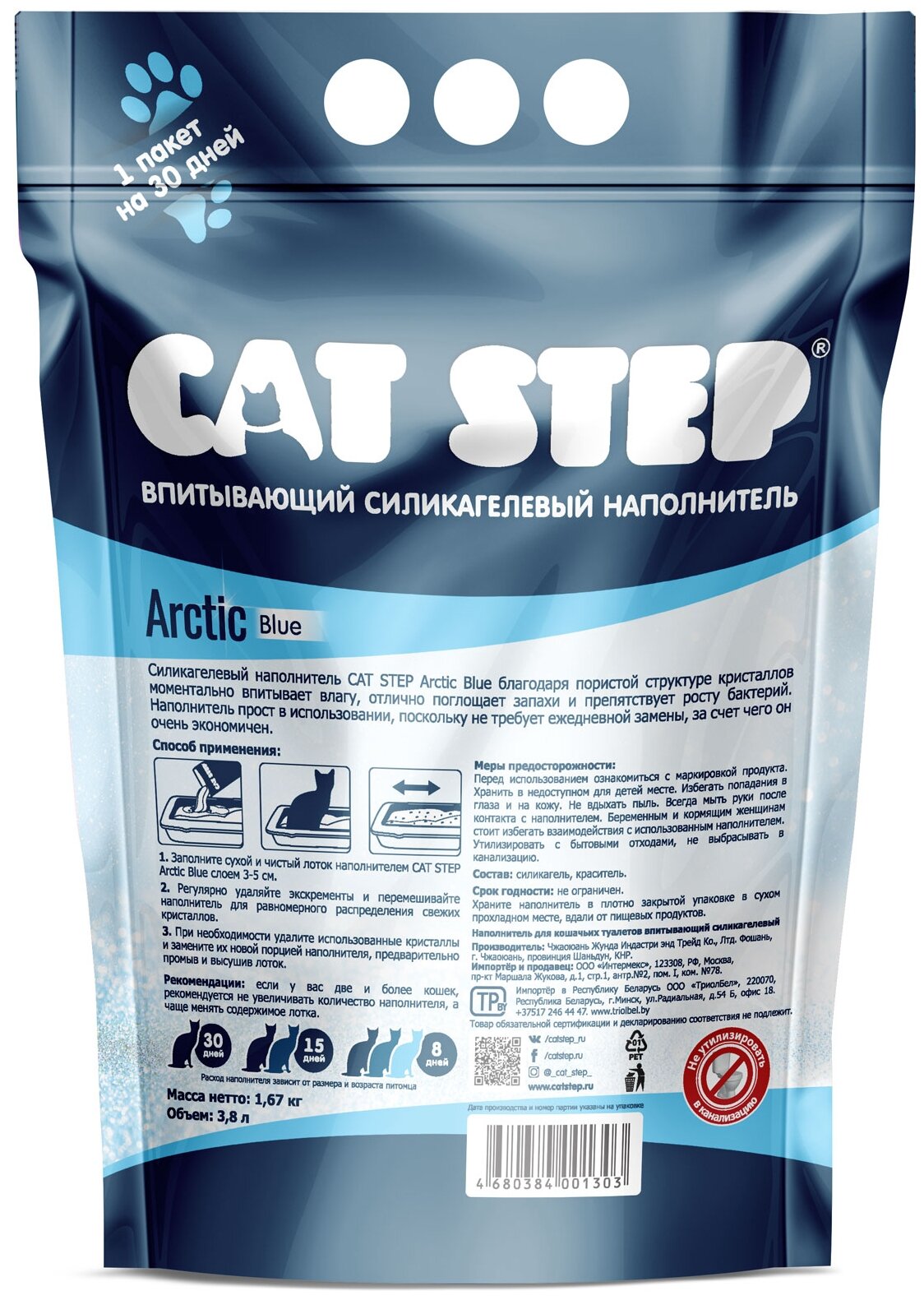Состав товара:100% силикагель.Меры предосторожности:Своевременно избавляйтесь от использованного наполнителя. Храните наполнитель вдали от пищевых продуктов. Всегда мойте руки после контакта с использованным наполнителем. Не выбрасывайте использованный наполнитель в унитаз.Способ применения:Наполните сухой и чистый туалет наполнителем слоем 3 см. Примерно через 4 недели удалите использованные кристаллы и замените их новыми. Дополнительного ухода не требуется. Использованный наполнитель необходимо убирать регулярно. Если у Вас не одна кошка рекомендуется не увеличивать количество наполнителя, а чаще его менять. Если Вашей кошке сложно привыкнуть к новому наполнителю, попытайтесь в первый месяц смешивать его со старым наполнителем в пропорции 50/50.