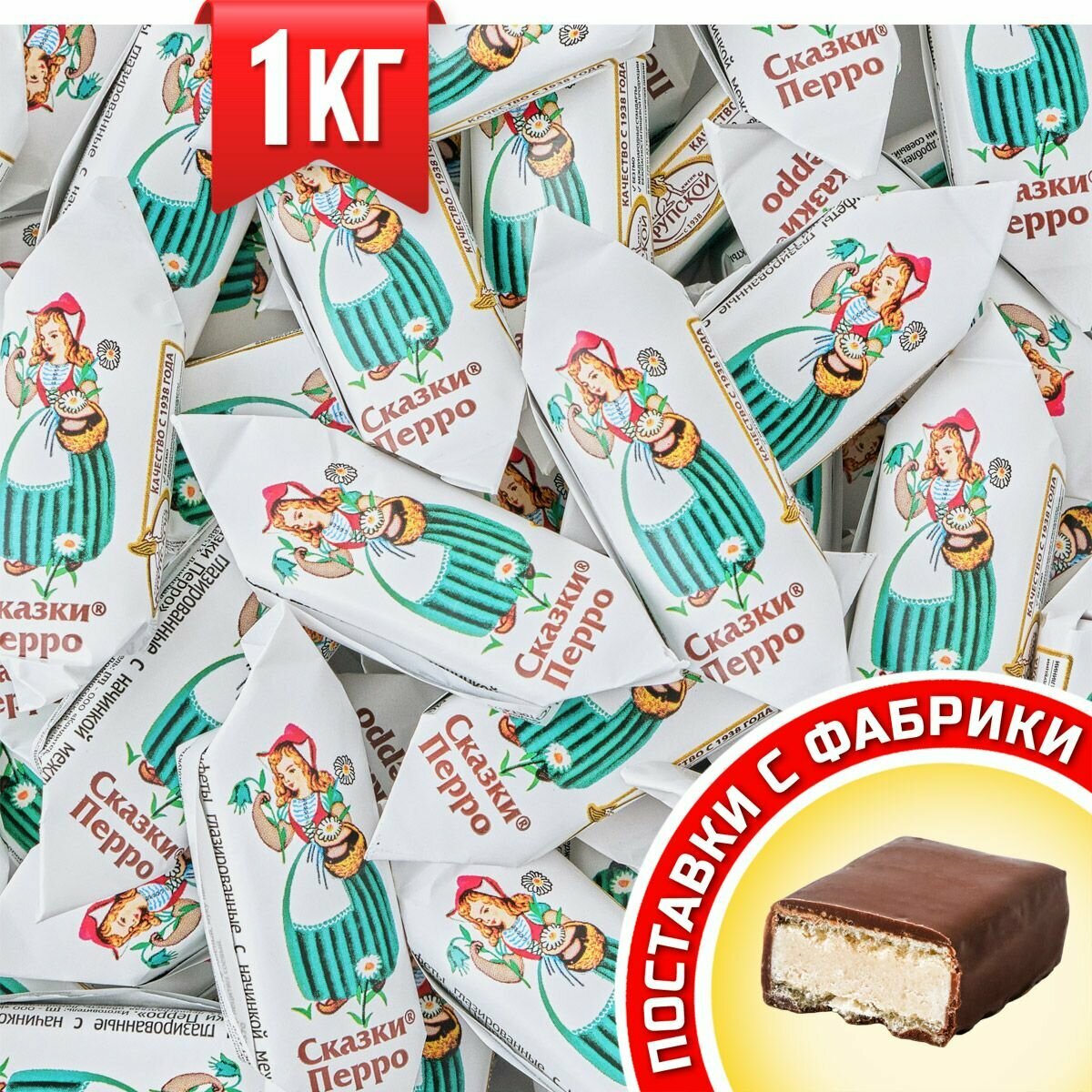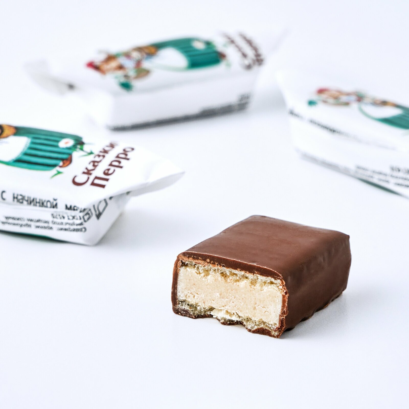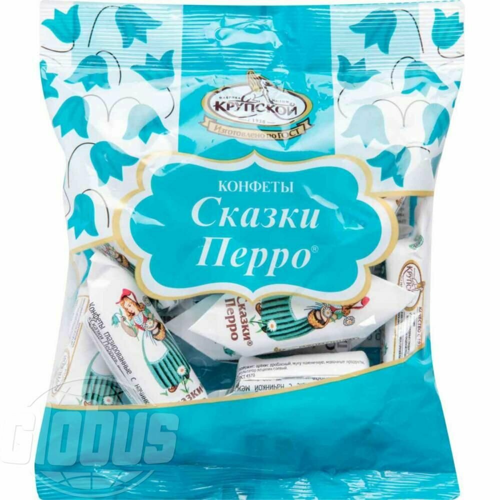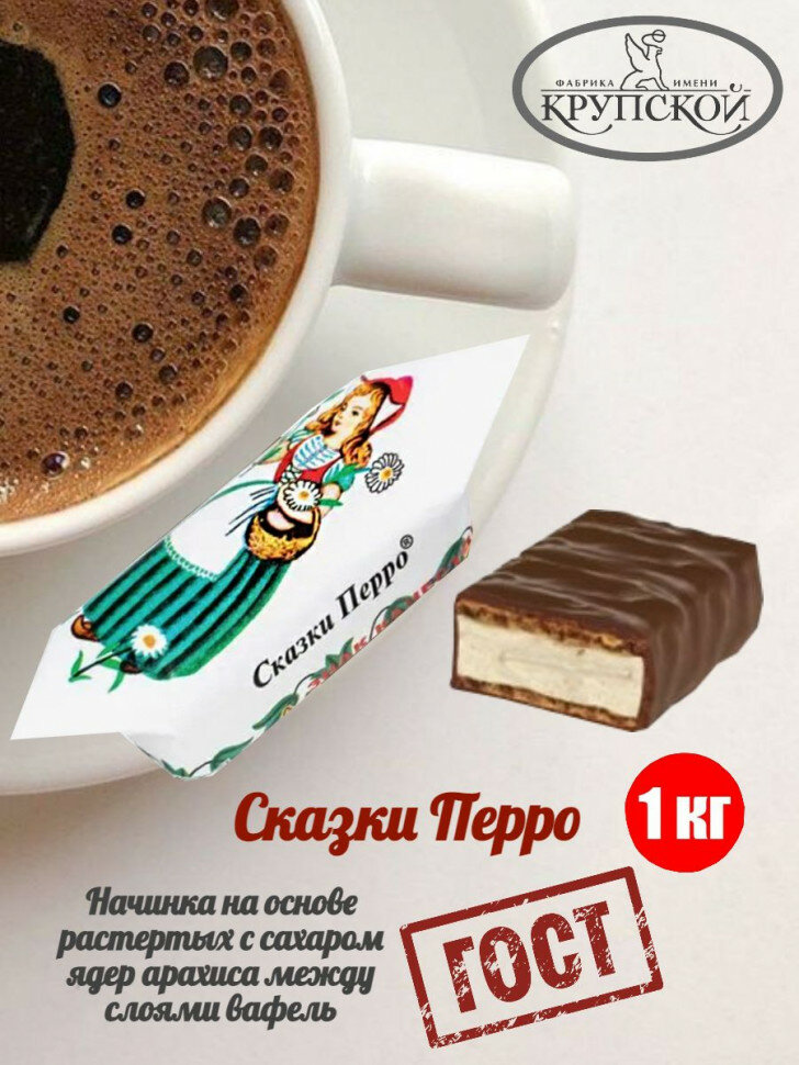 Глазированные конфеты «Сказки Перро» от кондитерской фабрики имени Крупской. Изготовлены на основе растертых с сахаром арахиса между слоями вафель. Мягкая и гладкая текстура. Обладают насыщенным шоколадным вкусом с легкой горчинкой. Идеально — к чаю или кофе.