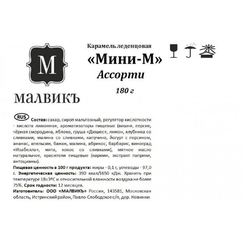 Карамель леденцовая "Мини-М", ассорти: "Классика" (со вкусом вишни, со вкусом персика, со вкусом чёрной смородины, со вкусом яблока); "Ретро" (со вкусом мяты, "Цирковая" со вкусом дюшеса и мяты, "Летная" со вкусом лимона); "Сливочная" (со вкусом клубники со сливками, со вкусом малины со сливками, со вкусом капучино, со вкусом кокоса со сливками, со вкусом йогурта с персиком); "Тропик" (со вкусом ананаса, со вкусом апельсина, со вкусом банана, со вкусом малины); "Южная" (со вкусом абрикоса, со вкусом барбариса, со вкусом винограда "Изабеллы", со вкусом дюшеса).