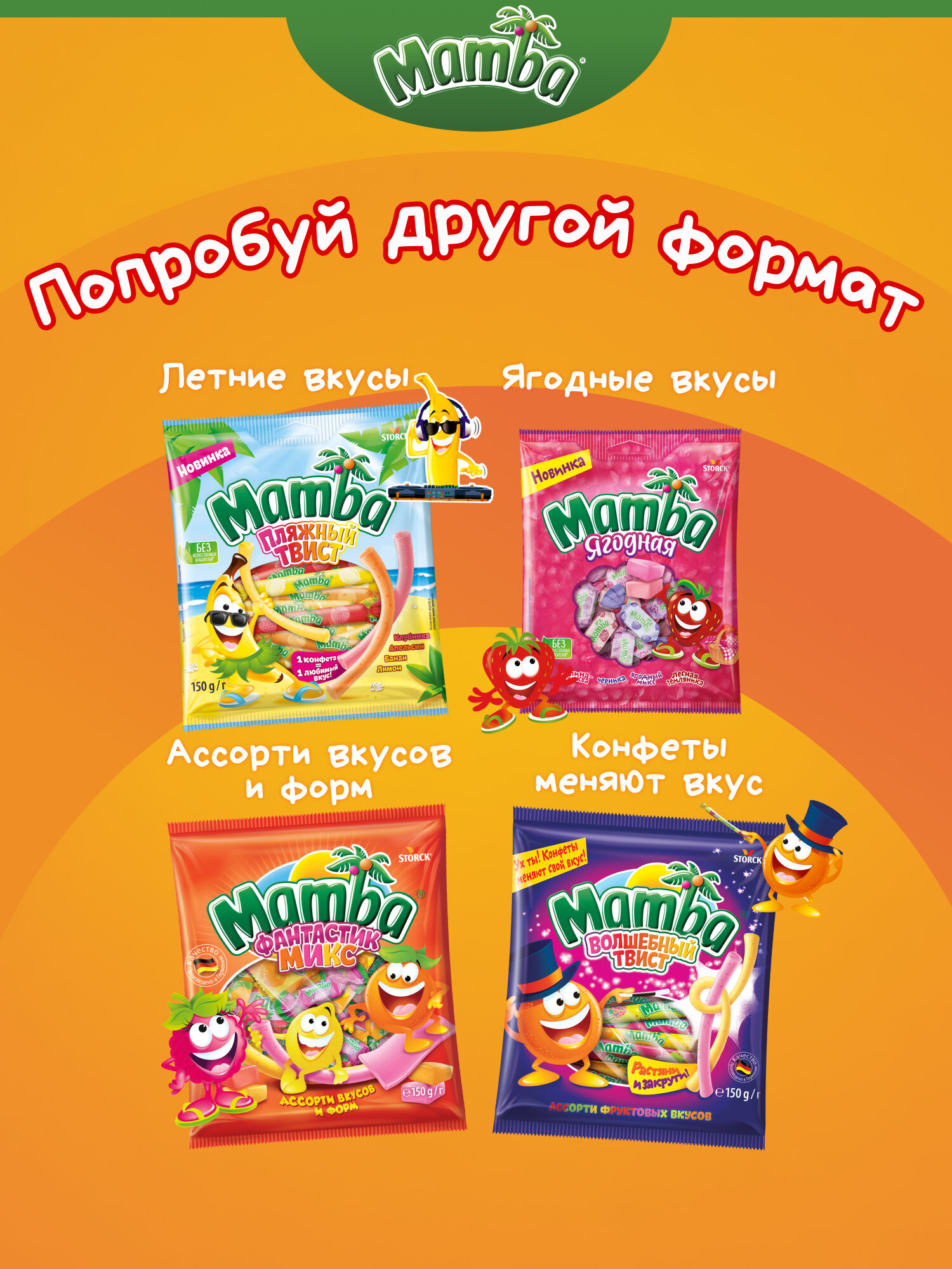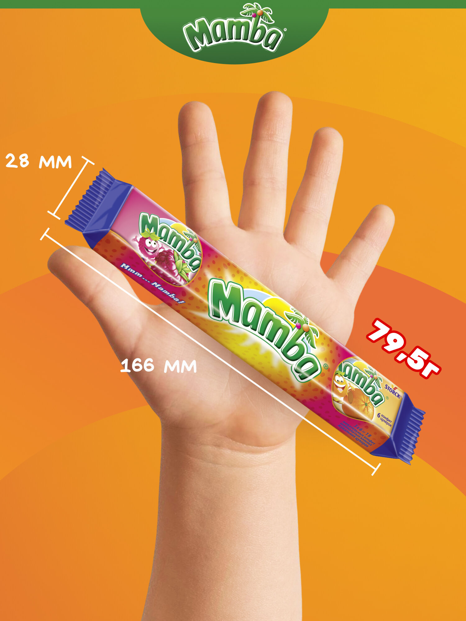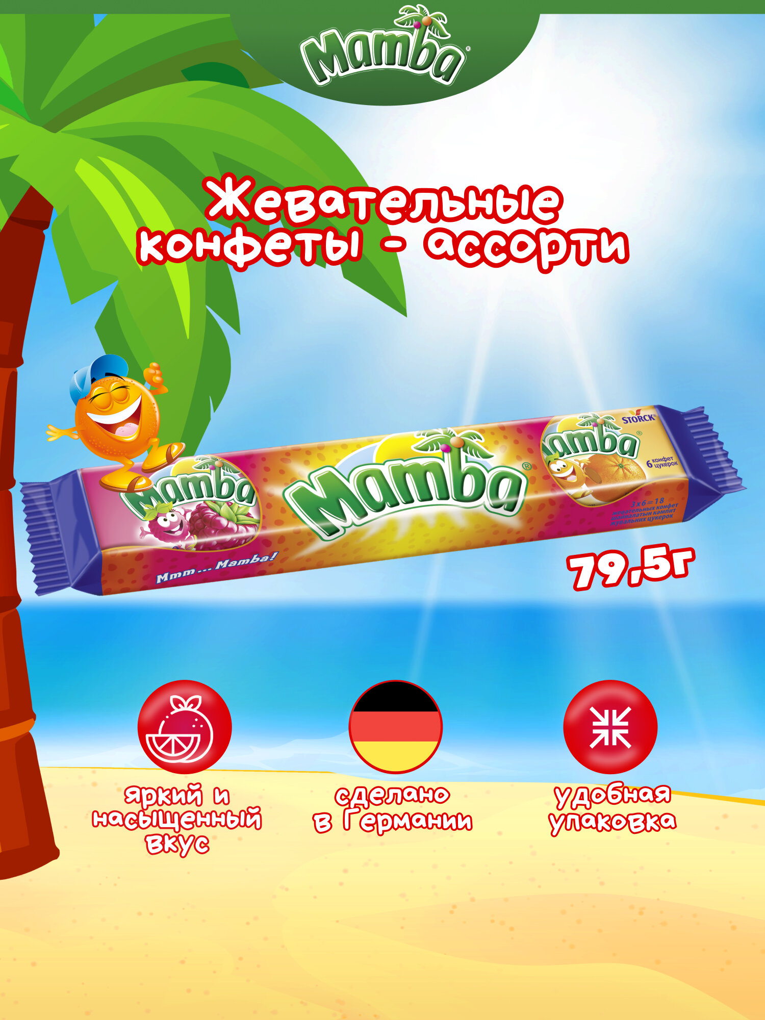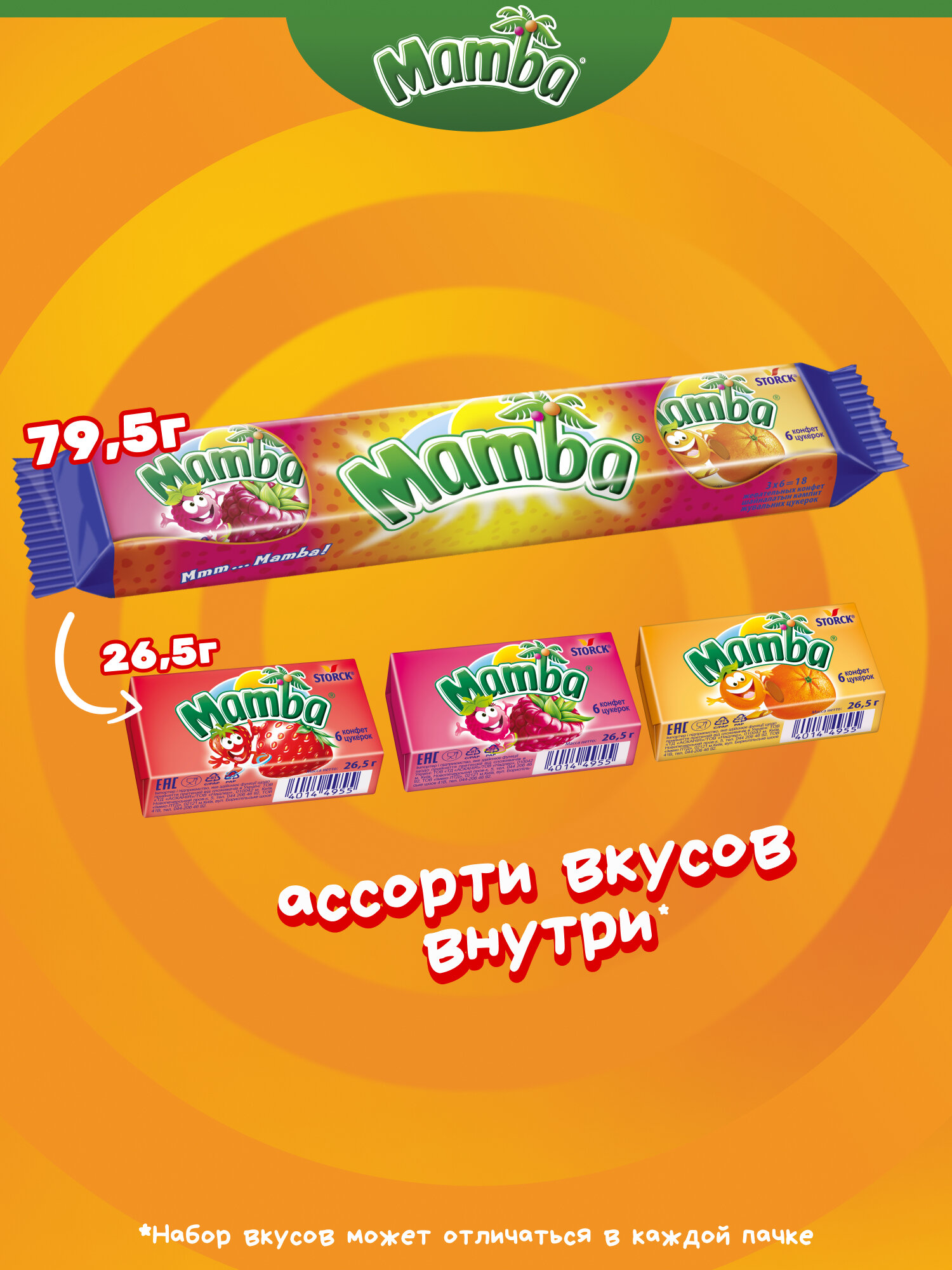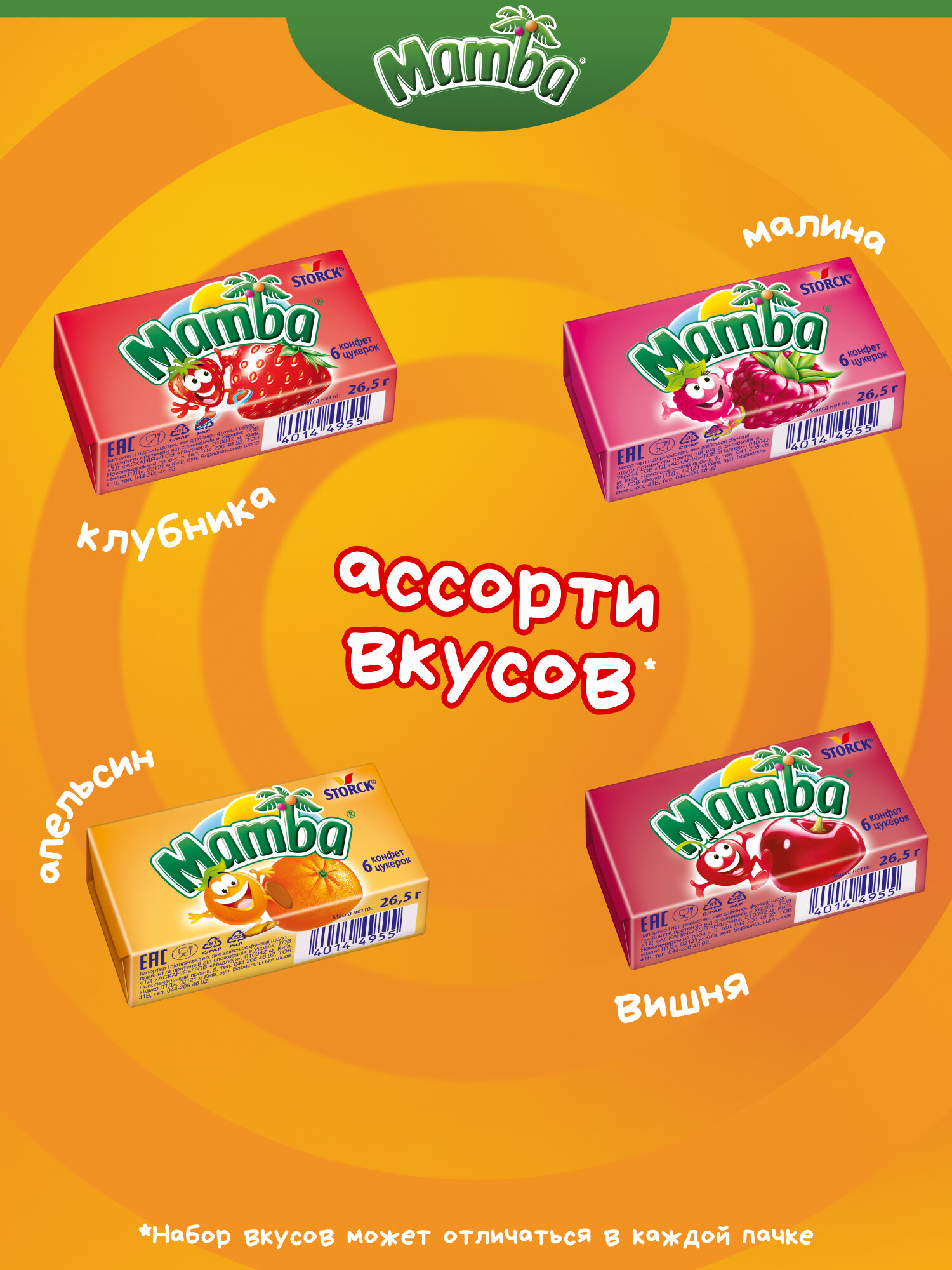 Каждый день во всем мире с помощью продуктов Storck компания делает жизнь людей немного слаще и счастливее. На протяжении десятилетий компания Storck успешно производит качественные кондитерские изделия. Начиная с 1903 года семейный бизнес Storck успешно растет и развивается. На сегодняшний день компания является одним из крупнейших производителей кондитерских изделий. Продукция радует своих потребителей более чем в 100 странах по всему миру! С каждым новым днем сотрудники компании Storck делают мир немного слаще и счастливей. Улыбки на лицах потребителей говорят: Storck – часть нашего мира! Компания сохраняет традиции по поддержанию высокого качества, надежности и благополучия. Mamba- это сочные жевательные конфеты с различными вкусами, которые пользуются популярностью среди детей и взрослых уже более 60-ти лет! Конфеты Mamba представлены в удобной упаковке, которую так легко брать с собой и делиться с друзьями. Mamba – это сочные жевательные конфеты со вкусами клубники, малины, апельсина, колы или вишни! Каждая упаковка состоит из шести жевательных конфет в индивидуальной обертке. В большой упаковке вы найдете ассорти вкусов, чтобы поделиться с друзьями.