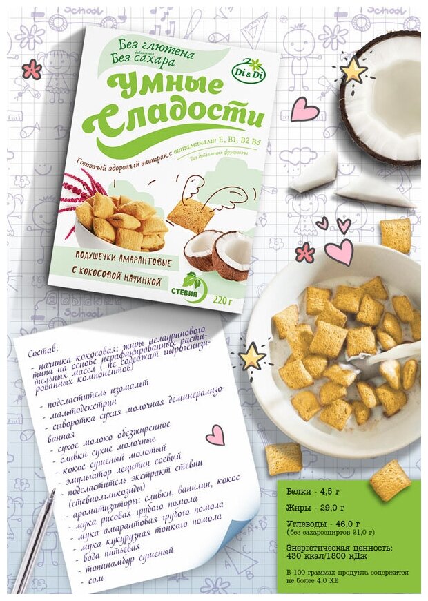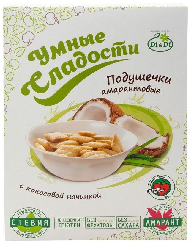Многие любят хлопья на завтрак, но отказывают себе в этом удовольствии из-за их высокой калорийности или плохого состава. Амарантовые подушечки от производителя "Умные сладости" не содержат сахара, глютена и фруктозы. Напротив, в них много микроэлементов, аминокислот и витаминов, а топинамбур в составе обогащает продукт клетчаткой и инулином. Хрустящие подушечки с кокосовой начинкой не только полезные, но и неимоверно вкусные. Залейте их теплым молоком и сделайте даже раннее утро добрым.