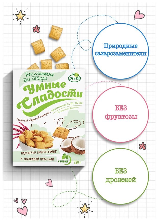 Сервис сравнения цен СкидкаГИД предлагает сравнить цены на товар «Подушечки Умные сладости амарантовые с кокосовой начинкой без глютена 220г»