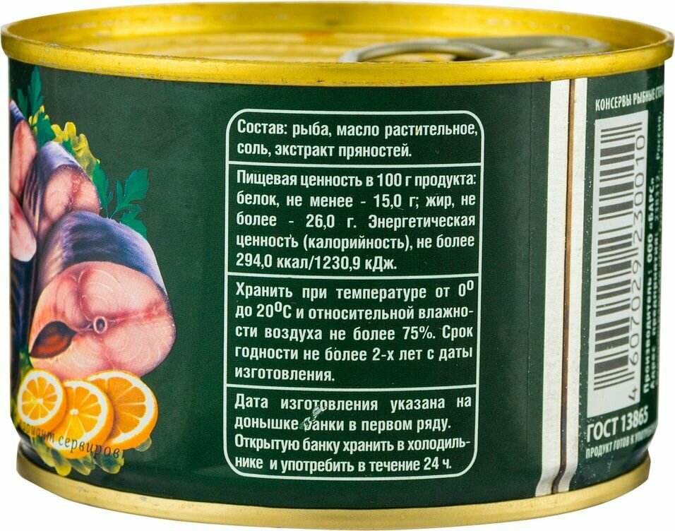 | Состав | рыба, масло растительное, соль, экстракт пряностей. |