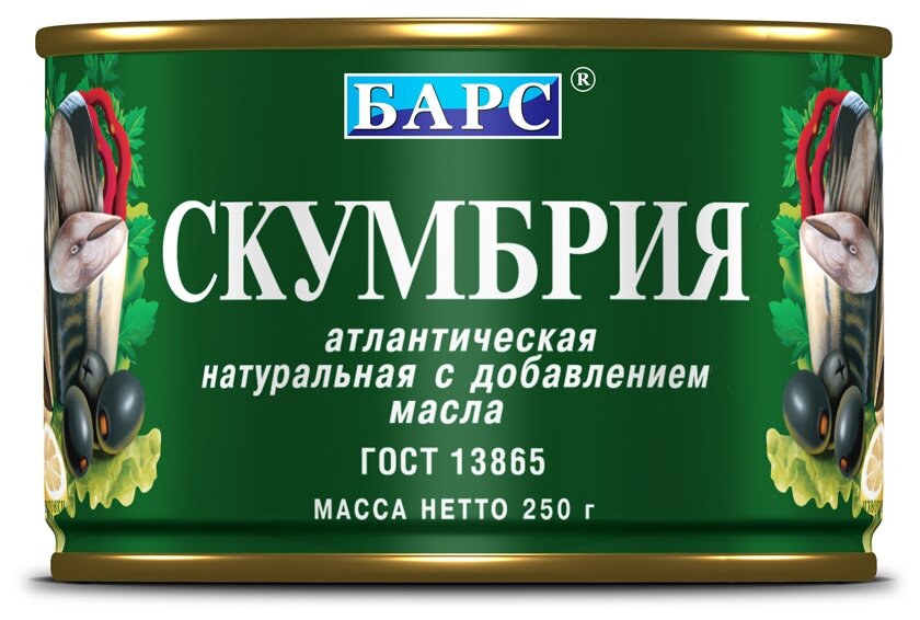 Барс Скумбрия атлантическая натуральная с добавлением масла, 250 гСкумбрия атлантическая натуральная с добавлением масла "Барс" 250 г представляет собой высококачественные рыбные консервы, изготовленные по ГОСТ 13865. Продукт производится ООО "Барс", известным производителем консервов из рыбы и морепродуктов.Состав продукта включает рыбу, растительное масло и соль. В 100 г продукта содержится 15 г белка, 26 г жира и 294 ккал энергии.Продукт упакован в жестяную банку, что обеспечивает его сохранность и удобство использования. Срок хранения составляет 24 месяца при температуре от 0 до 25 градусов Цельсия и относительной влажности воздуха не более 75%.Выбирая барс Скумбрия атлантическая натуральная с добавлением масла, вы получаете качественный продукт, который станет отличным дополнением к вашему столу и разнообразит ваше меню.