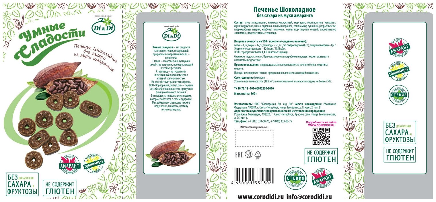 Состав: мука кукурузная тонкого помола, мука амарантовая грубого помола, маргарин, подсластитель изомальт, какао-порошок, крахмал кукурузный, топинамбур сушеный, яичный порошок, соль, разрыхлители: гидрокарбонат натрия, карбонат аммония, эмульгатор лецитин соевый, ароматизатор ванилин, подсластитель стевиозид