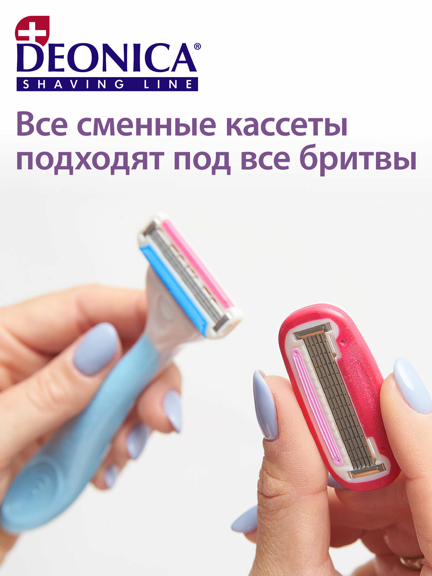 Уникальная система безопасных бритв Deonica позволяет использовать любые кассеты Deonica: на 3 или 5 лезвий.