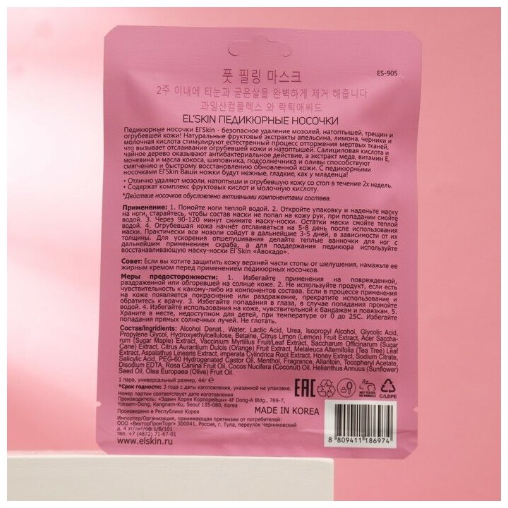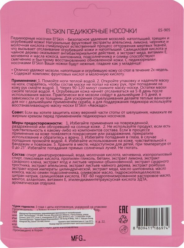 1877217 Отшелушивающие педикюрные носочки El'Skin Peeling Foot, 1 пара Педикюрные носочки El'Skin — это инновационное корейское средство 2 в 1 (маска и носки), которое позволяет обойтись без салонных процедур и отшелушивающих ванночек. С приходом тёплых деньков, каждая женщина достаёт из шкафа красивые открытые туфли и привести стопы ног в идеальное, ухоженное состояние становится одной из главных целей. Именно для этого и предназначены педикюрные носочки El'Skin. Носочки не только эффективно удаляют мозоли, натоптыши, грубую и потрескавшуюся кожу стоп, а также предотвращает огрубление кожи и образование трещин, регулируют деятельность потовых желёз, стимулируют обменные процессы, повышают эластичность и упругость кожи. Гликолевая и молочная кислоты, а также экстракты апельсина и лимона, входящие в состав маски, способствуют естественному и безболезненному удалению отмерших клеток кожи, мозолей и натоптышей. Ромашка и салициловая кислота оказывают антибактериальное и успокаивающее действие на кожу, а экстракты яблока, папайи и другие растительные экстракты оказывают увлажняющее, смягчающее и восстанавливающее действие. Маска в форме носков делает процедуру пилинга очень простой. Кожа начинает отслаиваться уже на 2-4 дней после использования маски. И через 10-12 дней кожа становится мягкой, гладкой и нежной. Результат маски сохраняется на 2-3 месяца.