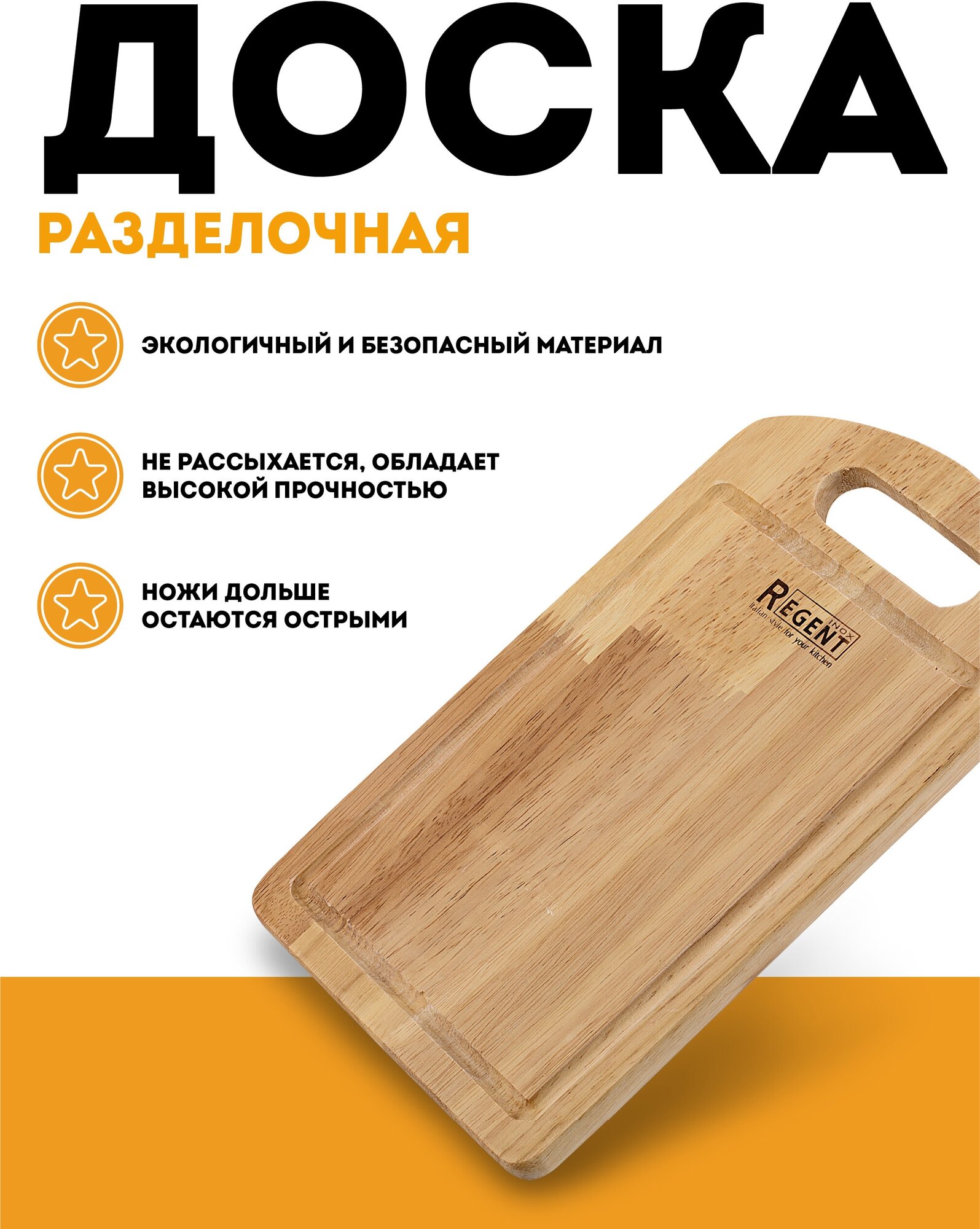 Высокую прочность и надежность разделочной доски Bosco от Regent Inox из гевеи оценят все хозяйки. Она не растрескивается при перепадах температуры и не деформируется при долгом использовании. Высокое качество шлифовки, привлекательный дизайн и функциональность изделия сделают эту посуду любимым предметом на кухне. Разделочная доска – это яркий и простой в применении аксессуар для разделки продуктов, который заметно повышает эффективность приготовления многих продуктов.