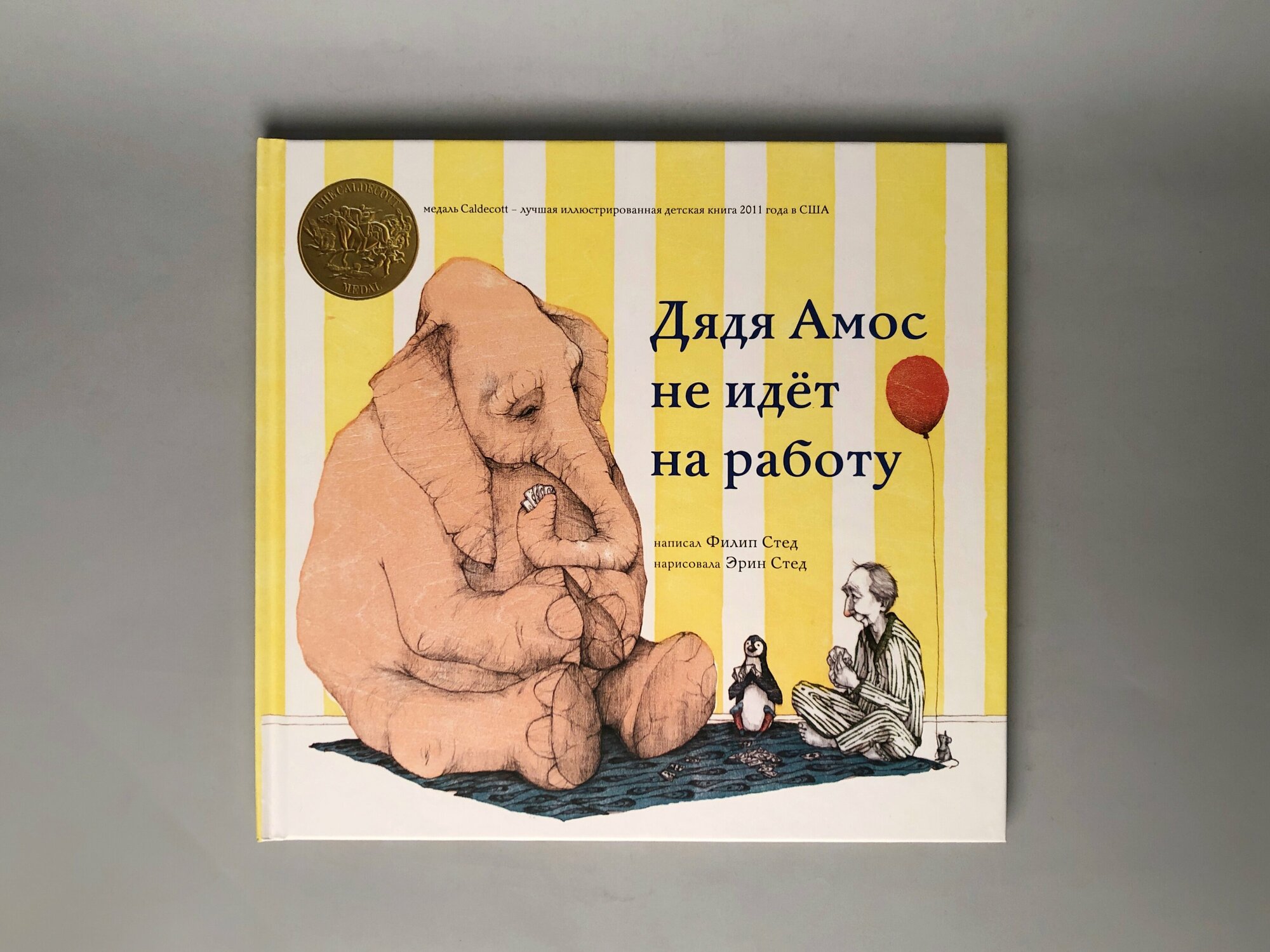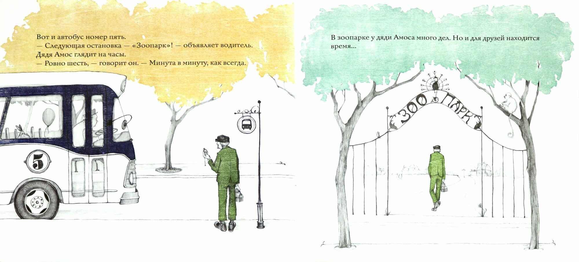 Дядя Амос живет один и работает в зоопарке. Каждый день ровно в шесть он садится в автобус № 5 и едет на работу. Там он играет в шахматы со слоном, читает книжку сове и вытирает нос носорогу. Но однажды дядя Амос заболевает и остается дома. Как вы думаете, кто нальет ему чаю, почитает книжку и сыграет с ним в шахматы? Ну, конечно же! Теперь очередь черепахи, совы, слона, носорога и пингвина садиться в автобус №5. Чтобы поиграть с дядюшкой, принести носовой платок и почитать на ночь. Авторы книги - супруги Эрин и Филипп Стэд. Филипп сочинил сказку для Эрин, а Эрин нарисовала очень хорошие картинки (в 2011 году "Дядя Амос" получил медаль Caldecott - ею награждают "лучшую иллюстрированную детскую книгу года" в США).