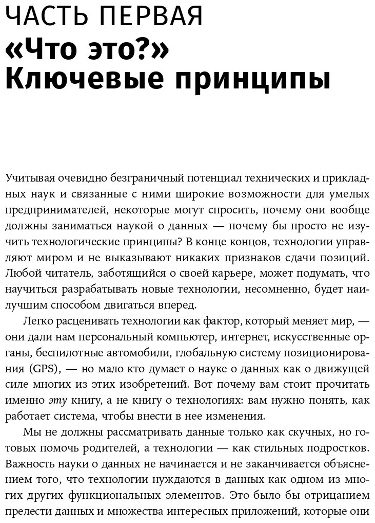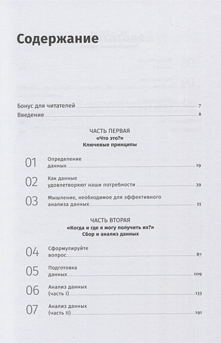 Сама книга больше походит на краткий обзор того, что вообще есть в мире анализа данных. Обзор без проникания в глубь, скорее поверхностный. Однако это не является минусом, так как цель книги не научить, а показать чему можно научиться. В этом плане есть очень похожая книга "Просчитать будущее" Эрика Сигеля, где также дан обзор методов анализа данных, но на другизх примерах.