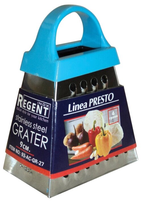 Небольшая тёрка Regent Inox Presto подходит для быстрого и простого трения чеснока, лимонной или апельсиновой цедры либо шоколада. Она изготовлена из безопасных для здоровья материалов-нержавеющей стали и пластика. Кроме того, благодаря свойствам этого металла, лезвия у этого аксессуара очень прочные, достаточно острые и долго держат заточку. Изделиепрекрасно моется в посудомоечной машине. Эргономичная синяя ручка не выскальзывает из рук, делая процесс обработки продукта более быстрым и комфортным. Терка имеет прочный корпус и маленький размер 9 см, которые позволяют без усилий удерживать посуду в руках.Технические характеристики:6,5х4,5х9см; 0,042кг; Нержавеющая сталь, пластик; 4 грани