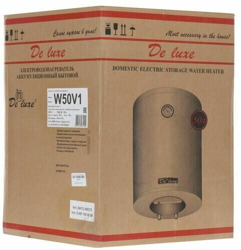 Электрический накопитель-водонагреватель производителя De Luxe модель максимально надежный и экономичный в использовании. Представленная модель электрического прибора для быстрого нагрева воды регулируется с помощью специальной ручки, которая расположена на панели управления. Для безопасного использования предусмотрен предохранительный датчик от перегрева водонагревателя. Внутренний бак изготавливается из специальной низкоуглеродистой нержавеющей стали, которая применяется в медицине.