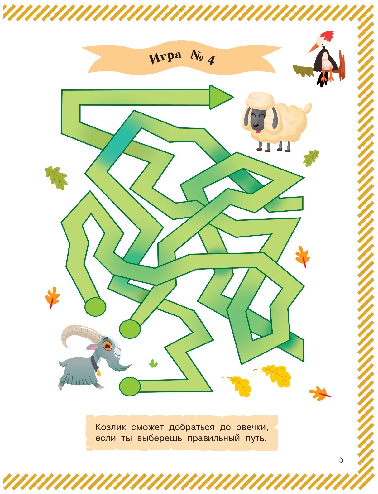 Есть задания с буквами для умеющих читать. Есть простецкие лабиринты или "найди два одинаковых". Дорисовать, найти отличия, посчитать, силуэты... Разнообразно в общем. Всего 58 заданий (игр). В конце есть раздел с ответами, что приятно.